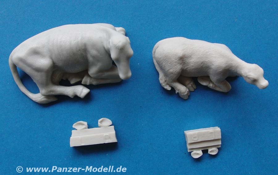 In diesem Set finden sich 6 Resinteile zum Bau von einer Kuh und einem Kalb.