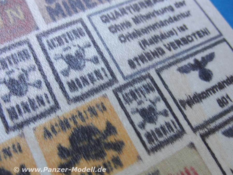 Der Hauptteil dieses Sets ist der Echtholzbogen auf den direkt verschiedene deutsche Schilder aus der Zeit des Zweiten Weltkriegs aufgedruckt sind. Dies ist für den Realismus natürlich unheimlich gut, zumal der Holzbogen realistisch dünn ist. Leider zeigt sich aber auch, dass Holz nicht unbedingt das optimale medium für hochfeinen Druck ist, denn das Druckbild erscheint etwas unscharf oder verwaschen.