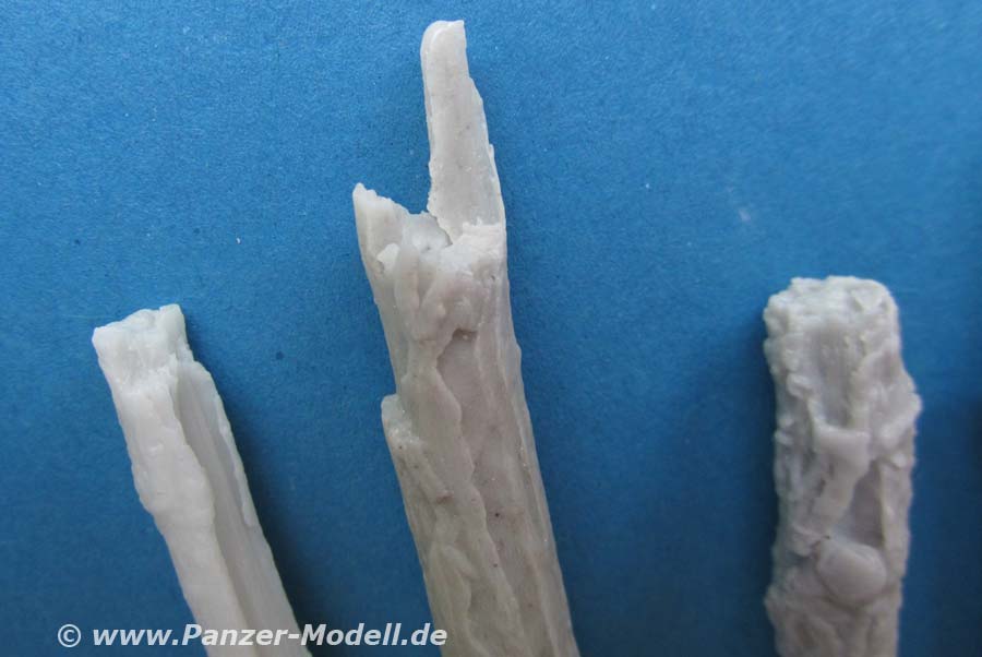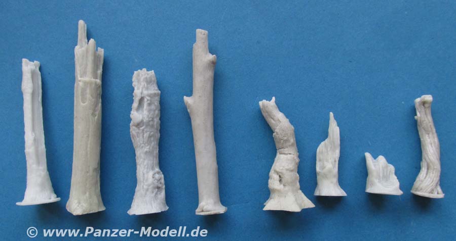 Die Baumreste sind jeweils so modelliert, dass sie stehend aufgebaut werden und somit unten den etwas dickeren Wurzelbereich.
