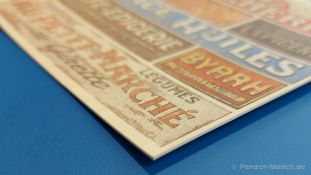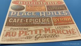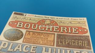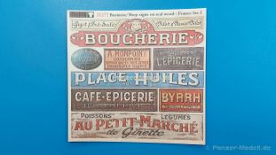 Dieses Set stellt französische Geschäftsschilder dar, die im Original auf Holztafeln aufgemalt waren. Um den Effekt so realistisch wie möglich wiederzugeben, sind die Schilder auf Holz gedruckt, das in einer dünnen Schicht auf dickes Papier aufgebracht wurde. Fugen und abgeblätterte Farbe geben den Schildern ein verwittertes Aussehen, so dass man sie nach dem Ausschneiden ohne viel Nacharbeit verwenden kann.