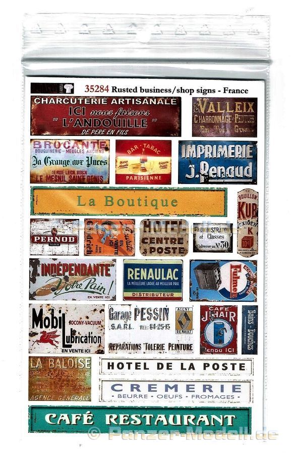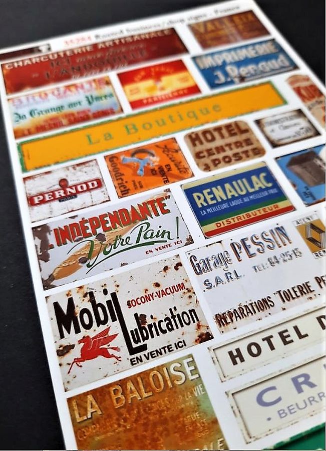 Im Original waren diese Schilder zumeist aus Blech und kamen gegebenfalls emailliert oder lackiert zum Kunden. (Interessant: Viele Tafeln wurden damals auch durch den schon lange ausgestorbenen Beruf des Schildermalers erstellt. ) Und damit alles nicht zu steril wirkt sind alle Schilder in einem mehr oder weniger altersbedingten Zustand dargestellt. Rostflecken, Ausbleichzngen etc, alles überzeugend und realistisch. Ein für mich sinnvolles Set. Dioramen und Vignetten können durch den Einsatz der entsprechenden Schilder farbiger und lebendiger gestaltet werden. Laut Hersteller kann dieses Set auch für den Maßstab 1:48 verwendet werden. Absolut empfehenswert!