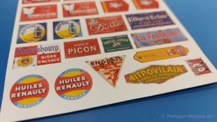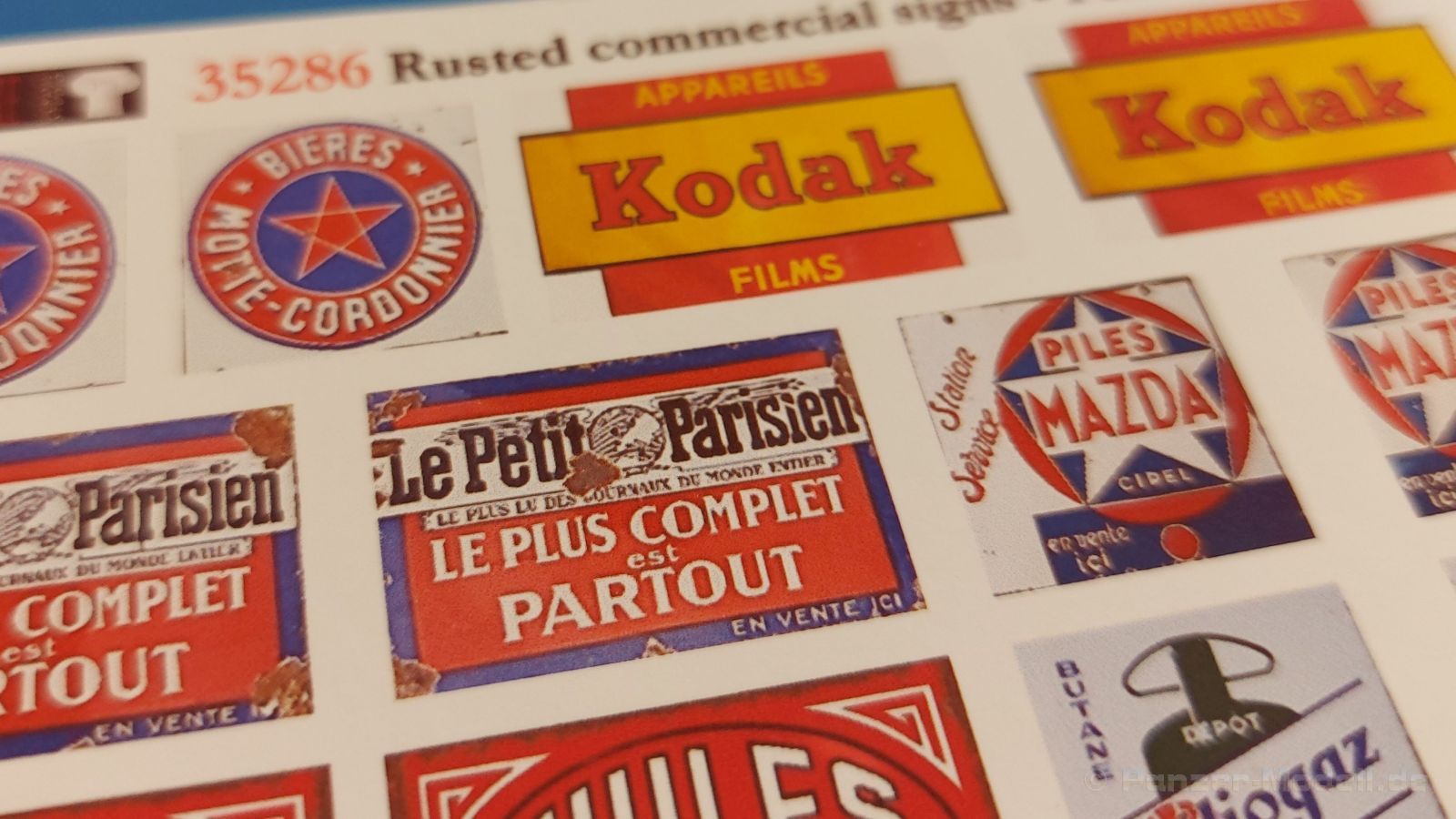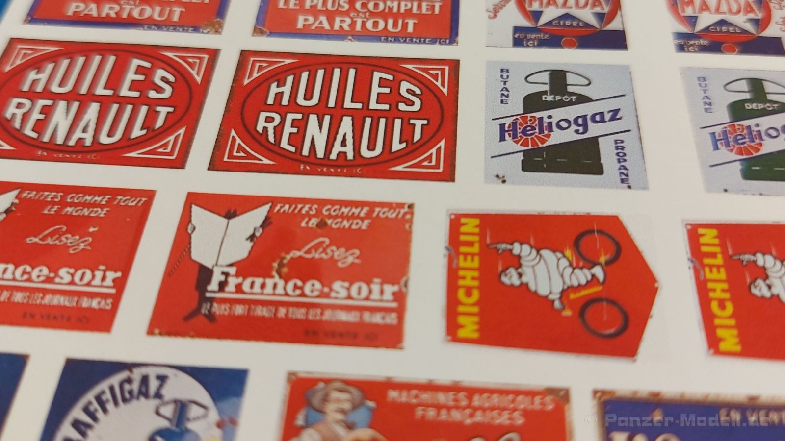 In dem Klarsichttütchen mit Zip-Verschluss sind neben dem 10 x 14 cm großen Papier auch drei feine Drähte dabei, mit den man Aufhängungen für manche Schilder bauen kann. Eine Anleitung dazu gibt es nicht, aber auf der Hersteller-Webseite findet man Beispiele hier. Ein sinnvolles Set, mit dem man ein in Frankreich spielendes Diorama ausstatten kann. Für ca. 7 Euro bekommt man 10 Schilderpaare (immer 2 gleich Schilder (also Vorder- und Rückseite, wenn man sie mit dem Draht aufhängt), die sich durch verschieden große und anders positionierte Rostflecke unterscheiden und 10 Einzelschilder, die man z.B. direkt an einer Wand anbringt. Vorgesehen für Verwendung in 1:35-er Dioramen, kann man sie laut Hersteller auch noch für 1:48