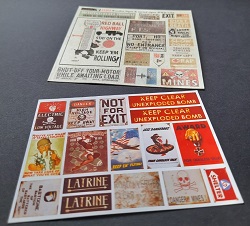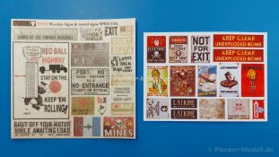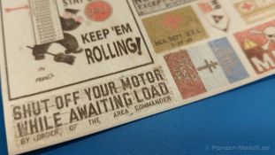 Die 15 auf Holz gedruckten Schilder in Englisch erhalten zusätzlich durch Fugen und abgeblätterte Farbe ein realistisches und leicht verwittertes Aussehen, so dass man sie nach dem Ausschneiden ohne viel Nacharbeit verwenden kann. Am auffälligsten ist natürlich der Red Ball Highway, dessen Schild man auch ggfs. freistehend an Holzständern anbringen kann. Ansonsten gibt es Warn-, Anweisungs- und Hinweisschilder, wie man sie in Depots und an Anmarschstraßen der US-Armee im Europa (größtenteils im Frankreich) des 2. Weltkrieges findet. Auf dem Fotopapier gibt es 16 Schilder, hochauflösend gedruckt, bereits mit Verwitterung und Rostflecken versehen, die vor Blindgängern, Minen und elektrischen Einrichtungen warnen, auf Schutzräume und Latrinen hinweisen und sonstige Hinweise/Warnungen enthalten. Für ca. 8,50-9,00 Euro bekommt man über 30 Schilder, die für 1:35 vorgesehen sind, aber laut Hersteller auch noch für 1:48 nutzbar sein sollen.
