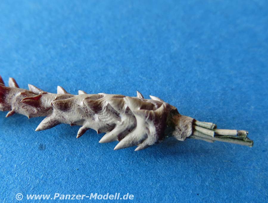 Die Bemalung des Stammes und der Blätter finde ich recht gelungen, wobei man beim Stamm sicher mit einem ordentlichen Mattlack noch mehr Realismus erzeugen kann. Die Blätter sind mehr oder weniger einfarbig grün. Hier könnte man sicher nach Vorbild noch mehr farbliche Variation in grün und vor allem brauntönen bei den unteren Blättern reinbringen.