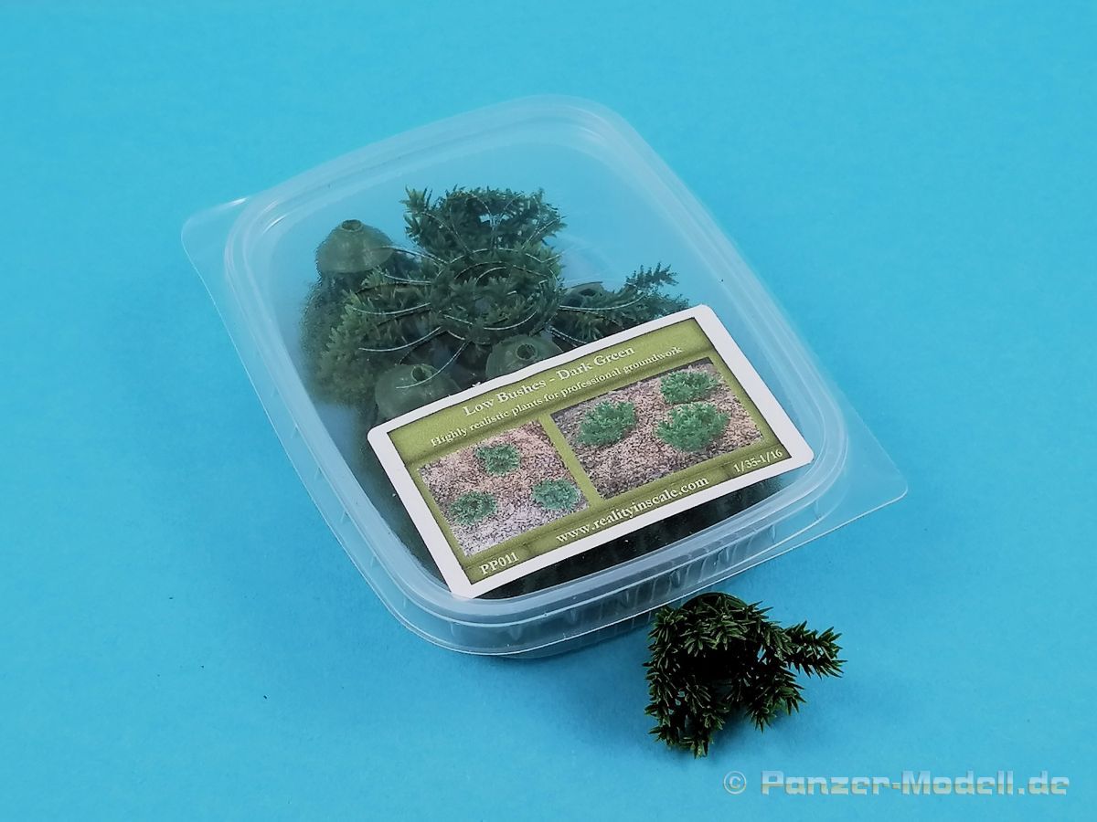 In der (etwas eigenwilligen) Box finden 15 Pflanzen (ca. 2 cm hoch) aus eingefärbten Weichplastik ihren Platz. Leider ohne Angabe eines Namens; lediglich der Hinweis “Low Bushes”. Dieser Umstand macht es etwas schwer auf einen bestimmten Maßstab zu schließen. Siehe Bildteil: Figur in 1:35. Im Ganzen gesehen macht das Grünzeug keinen schlechten Eindruck, von ein paar Ausfransungen abgesehen. Ein MUSS ist m.E. aber eine farbliche Behandlung. Zumindest ein Mattlack sollte verwendet werden damit der doch glänzende Plastikglanz verschwindet.