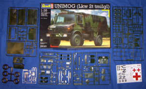 Katalognummer 03020 bietet Revell das Arbeitstier der Bundeswehr, den Unimog (LKW 2t milgl) an. Der Unimog besteht aus 190 Teilen an vier Spritzlingen. Einige Teile haben einen leichten Gussgrat, der aber einfach versäubert werden kann. Die Detaillierung ist etwas gröber als beim Fuchs, kann aber noch akzeptiert werden. Gewöhnungsbedürftig ist der Aufbau der Pritsche. Das Verdeck ist hier an die Seitenteile der Pritsche angegossen - will man das Fahrzeug also ohne Plane bauen, steht eine umständliche Trennarbeit ins Haus. Ärgerlich empfinde ich, daß die Pritsche innen nicht im geringsten detailliert ist - zumal das Verdeck am Heck geöffnet dargestellt wurde. Auch fehlen z.B. Sitzbänke für Soldaten - das wäre eine nette Dreingabe gewesen. Schön ist hingegen, daß man (im Gegensatz zum 10to MAN) den MG Drehring beigelegt hat - will man allerdings eine Figur ins Dachluk stellen (z.B. von Elite), so muß man das Kabinendach erst aufsägen - ein Durchbruch ist nicht vorhanden.