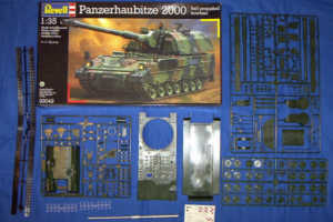 Revell Nummer 03042 verbirgt sich eines der modernsten Kampffahrzeuge der Bundeswehr - die Panzerhaubitze 2000. Die Mitte 1998 an die Bundeswehr übergebene PzH 2000 basiert auf dem bewährten Leopard II Fahrgestell und hat wahrlich imposante Ausmasse. Tortzdem ist die Panzerhaubitze mit 182 Teilen das "kleinste" Modell unseres heutigen Bundeswehr Specials. Die Teile erstrecken sich über drei Spritzlinge, Ober- und Unterwanne, sowie Turm liegen seperat bei. Ein absolutes Highlight ist sicherlich das beiliegende gedrehte Aluminium Rohr, welches sicherlich auch den für die Anzahl der Teile recht hohen Preis von ca. 50,- DM rechtfertigen soll. Die Teile sind sauber gegossen, die Oberflächendetaillierung allerdings stellenweise etwas grob. So sind z.B. die Schrauben für die optionale Zusatzpanzerung viel zu grob und zu groß. Sehr schön wiedergegeben sind hingegen die Anti-Rutsch Beläge auf Turm und Oberwanne. Erfreulich wäre sicherlich die Möglichkeit gewesen, das Turmheck geöffnet darstellen zu können - vielleicht nimmt sich ja auch hier ein Kleinserienhersteller dem Thema an. Die beiliegende Gummikette ist etwas gewöhnungsbdürftig - "Gummi" ist hier wörtlich zu nehmen, die Strukturierung dementsprechend eher unterdurchschnittlich. Ich werde diese Kette bei meinem Modell sicherlich gegen eine Plastikkette von Elite Modellbau austauschen.