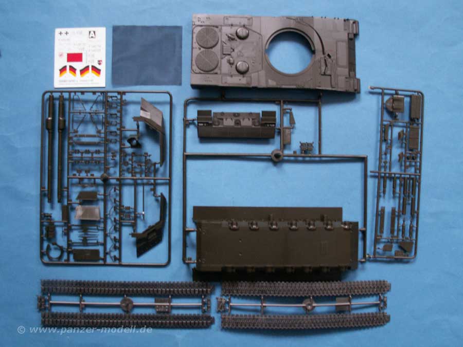 Der Bausatz umfasst 292 Teile an 5 Spritzlingen, wie auch Gummiketten in je zwei Teilen, Gittermaterial und einem Decalbogen. Dabei sind die Grundteile mit Turm, Wanne und Laufwerk bereits vom Leopard 2 A5 Bausatz bekannt. Neu ist eigentlich nur ein zusätzlicher Spritzling mit Zusatzteilen, wie dem DARKAS, Rohrwischergestänge und Granaten mit Transportboxen, sowie ein geänderter Spritzling mit Turmteilen und der langen L/55 Kanone, die die richtige Detailierung aufweist, gerade an der Verbindungsstelle der Wärmeschutzhülle zum verlängerten Stück. Aber auch die kürzere L/44 kanone ist enthalten, d.h. wer mag, kann auch den Leo 2 A5 bauen.