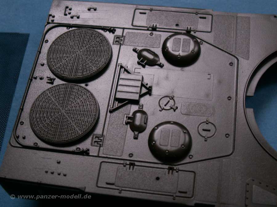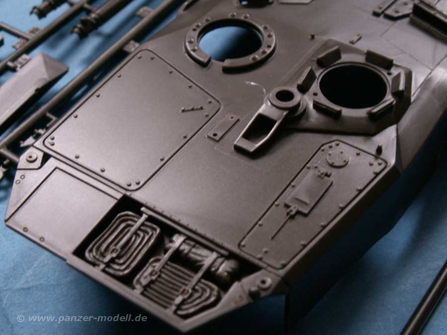 Die allgemeine Qualität ist gut, wenn auch nicht so fein wie beim Pendant von Tamiya. Leider ist die Turmoberseite auch immer noch glatt, ohne Antirutschbeschichtung, die der detailverliebte Modellbauer selber aufbringen müsste. Dafür sind die Antirutschpads auf der Wanne schön dargestellt und auch an sich ist die gesamte Detailierung der Teile ausreichend - auch wenn die Kette sicher besser gemacht werden könnte, zumal diese etwas sehr steif ist.