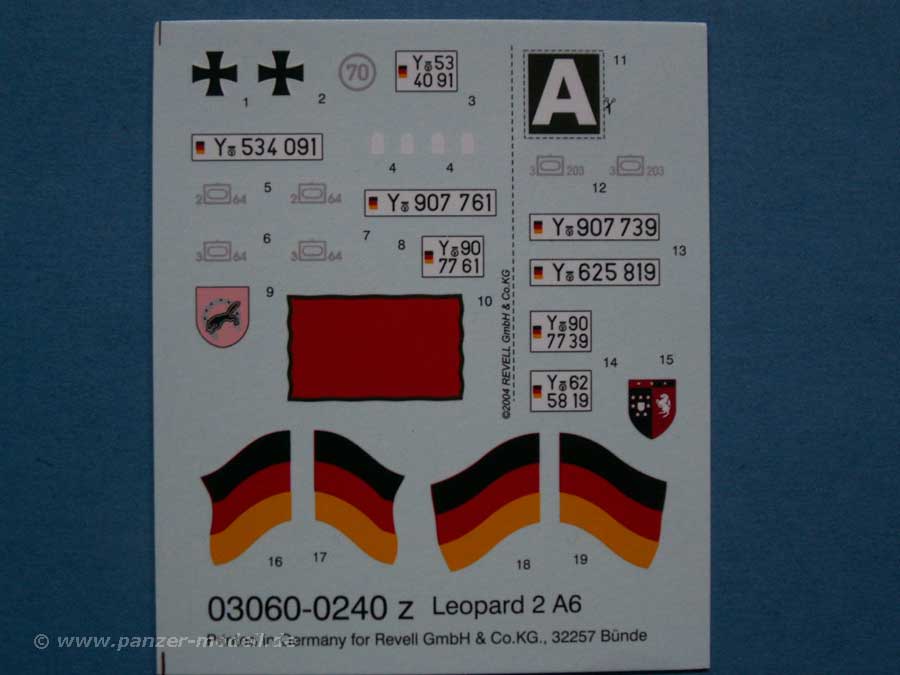 Der Decalbogen enthält neben Aufdrucken für eine rote und zwei Deutschland-Flaggen auch eiserne Kreuze (die aber etwas klein erscheinen), das MLC70 Schild, die weissen Flächen für das Tarnleitkreuz, sowie Nummenschilder, taktische Zeichen und Wappen für je zwei Versionen vom Pz.Btl.203 aus Hemer und vom PzBtl.64 aus Wolfhagen. Die Wappen wirken allerdings ein wenig zu groß geraten.