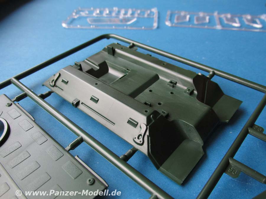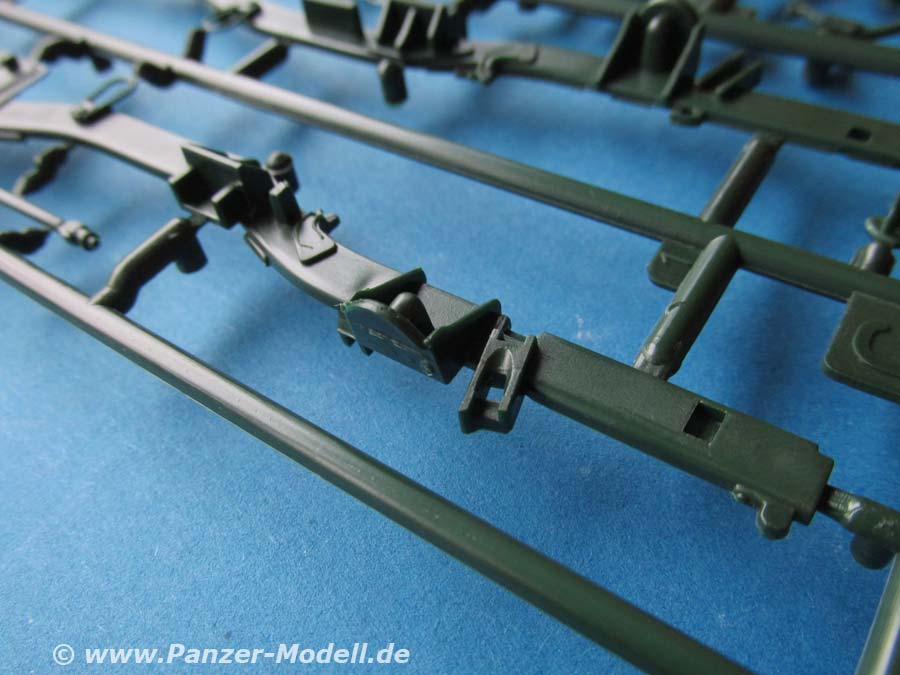 Der Leiterrahmen ist mehrteilig ausgeführt, was für schöne Details spricht, den Zusammenbau aber etwas kompliziert. Die Achsen sind komplett mit Antriebssträngen, Federung, Stabilisatoren und Co dargestellt. Und auch Getriebe und Motor sind im Bbausatz enthalten. Alles in bekannter Revell Qualität. Wer an der Vorderachse die Kanten etwas feilt, kann die Vorderräder sogar mit Lenkeinschlag darstellen.
