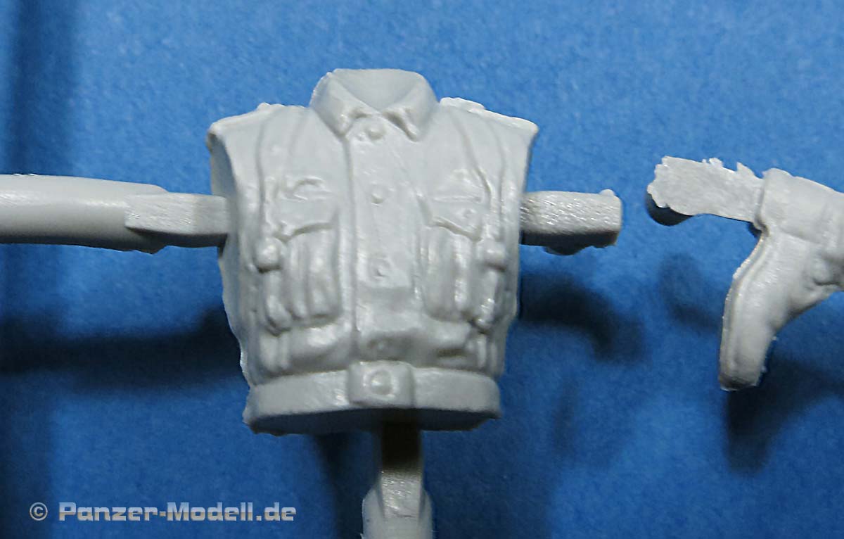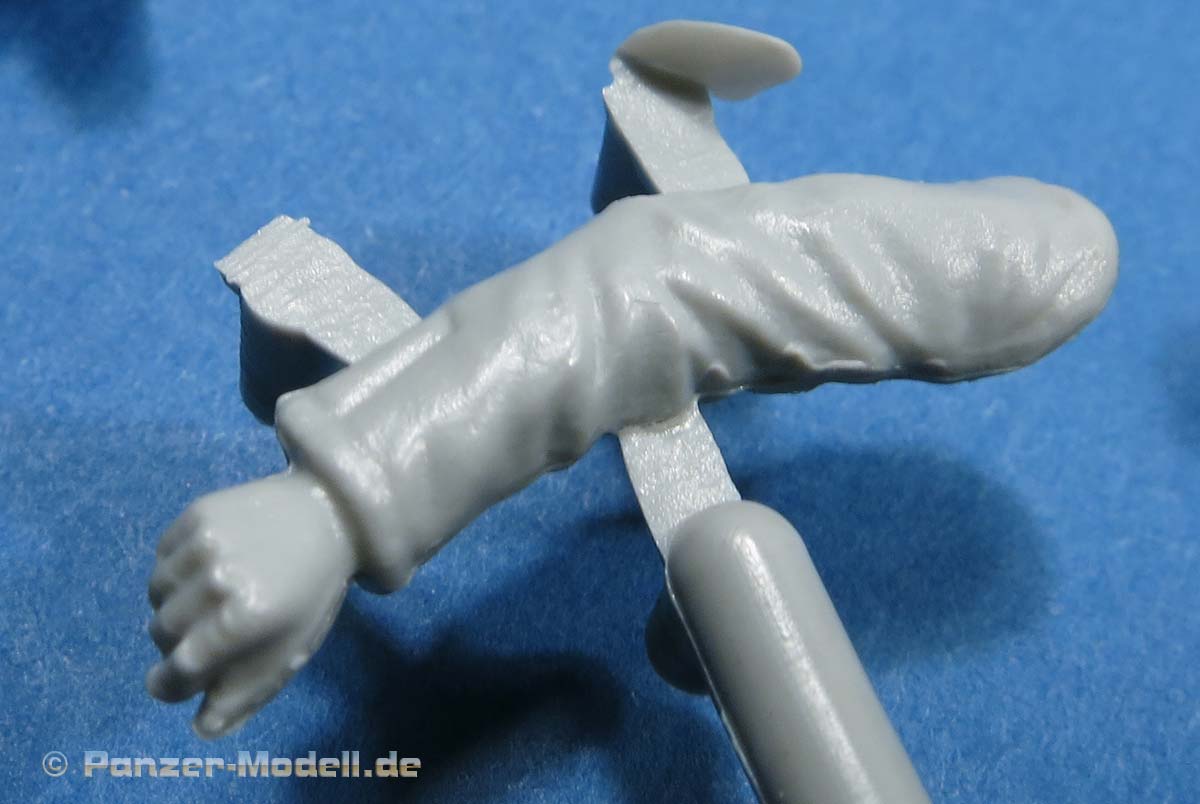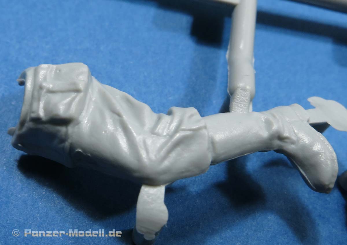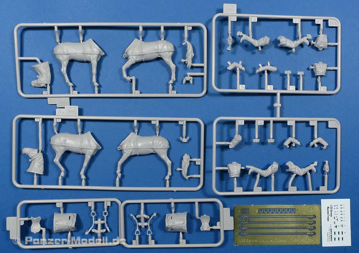 Die beiden Soldaten als Reiter setzen sich aus jeweils 6 Teilen zusammen und für jeden Soldaten liegen je zwei verschiedene Oberkörper bei. Die Details sind ganz ordentlich gemacht, wennauch ein wenig soft und Fischhäute an den Nähten. Zusätzlich liegt noch ein Bogen Decals bei für die Abzeichen der Figuren (Adler, Dienstgradabzeichen, Schulterklappen und Kragenspiegel)