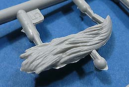 Der Rumpf jedes der beiden Pferde setzt sich aus zwei Halbteilen zusammen - das ist formtechnisch vermutlich die einzig sinnvolle Lösung, für den Modellbauer heißt es aber auch eine rundum laufende Naht, die wirklich akribisch entfernt werden muss, denn gerade bei Lebewesen sind solche gerade Nähte maximal unrealistisch. Die Köpfe hingegen sind zwar einteilig (bis auf die Ohren, die sind als ein Teil oben in den Kopf einzufügen), aber hier mit einer leichten Gussnaht und Fischhäuten, die auch versäubert werden wollen und schlussendlich muss der Kopf auch an den Körper ohne eine sichtbare Naht.