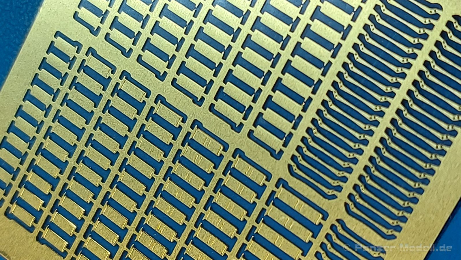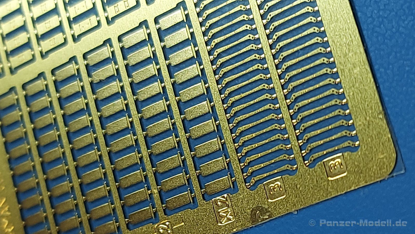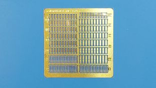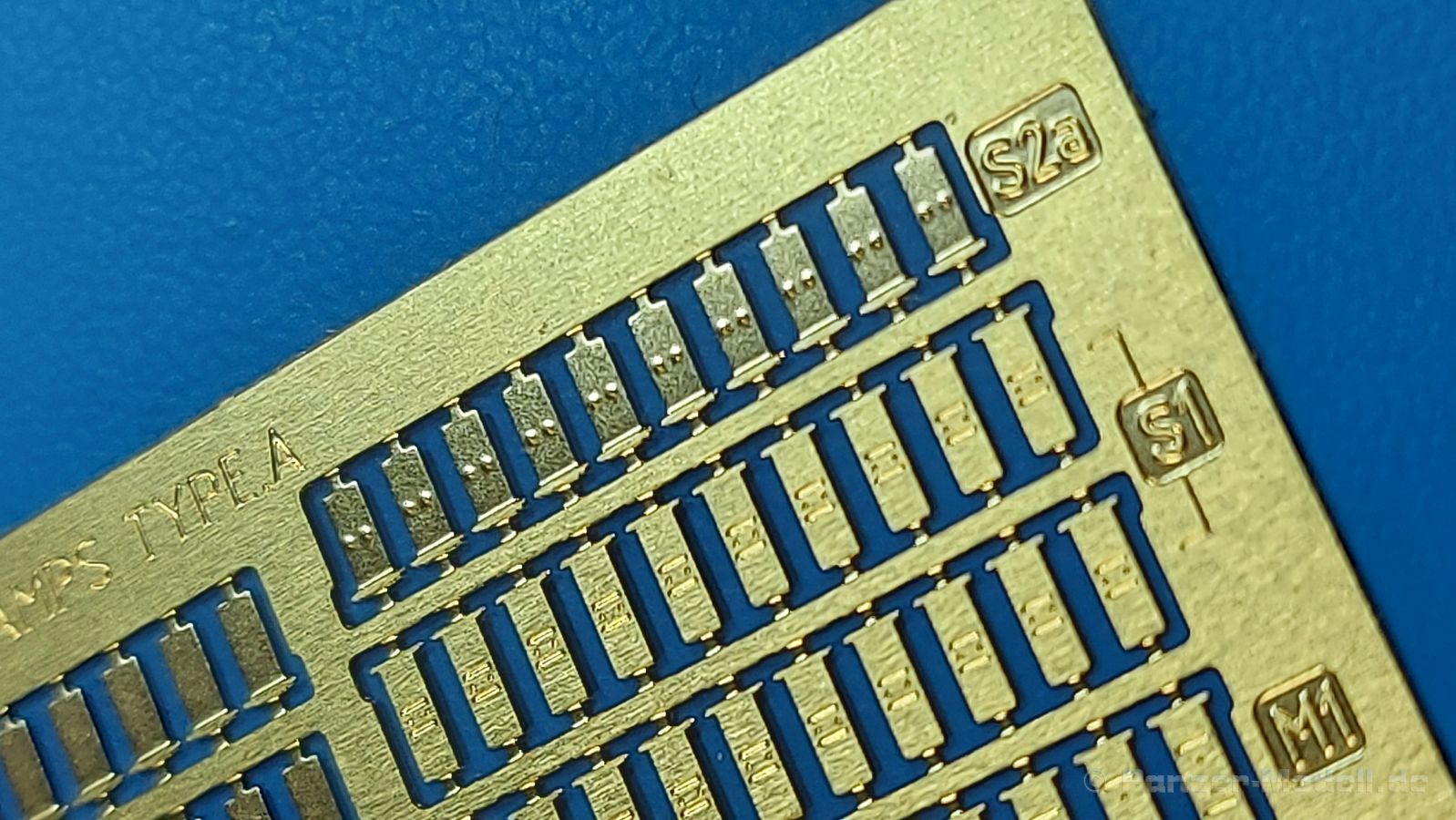 Werkzeughalterungen deutscher Panzer im 2. Weltkrieg sind an Modellen oft ans Werkzeug angegossen und grad bei älteren Bausätzen sehr einfach gehalten. Der chinesische Hersteller ROCHM bringt Werkzeughalterungen aus Photoätzteilen heraus, mit denen man die weniger guten ersetzen oder auch leere Halterungen darstellen kann. In einem 90 (115 mit Aufhänger) x 60 mm großen, wieder verschließbaren Klarsichttütchen befindet sich das PE-Set Type.A, zusammen mit einem Pappschild, das sowohl zum einen Schutz gegen unabsichtliches Verbiegen bieten soll, als auch als Konstruktionsanleitung gesehen kann. Das Set beinhaltet 180 PE Teile für 60 Halterungen. Diese teilen sich auf in 4 Arten, in Form und Größe unterschiedlich und wie folgt bezeichnet: