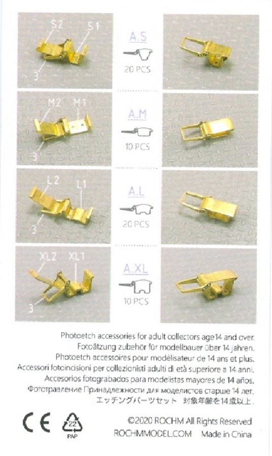 Pro Halterung gibt es ein Unterteil, das dann am Fahrzeug befestigt wird, einen Spannbügel und einen Verschlussriegel, der das Werkzeug hält. Beim Typ A wird jeder Spannbügel am Ende umgefalzt. Diese Falz greift beim Verschließen in die Falz des Unterteils. Die größten Teile sind flach ausgestreckt ca. 3 mm lang. Beim Falten und Biegen sollte man gute Augen und Geduld mitbringen. Auf der Rückseite des Pappschildes finden sich Fotos, die jede Halterung im geöffneten und im geschlossenen Zustand zeigt. In geöffnetem Zustand werden die benötigten Teilenummern angegeben. Die Bilder sind recht klein. Auf der Webseite von ROCHM sind sie in dreifacher Größe zu finden. Es gibt keine Angaben, für welche Werkzeuge die Halterungen dienen und an welchen Fahrzeugen sie angebracht werden können. Allerdings hat ein spanischer Modellbauer zumindest mit den Fahrzeugen mal befasst. Hier ist eine Liste von Carlos Findungen. Er bezieht sich zwar auf die 3D Druck Produkte, aber diese sind vom Typ die gleichen wie die PE Sets. Diese PE Halterungen werden ein Modell sehr aufwerten. Erfahrungen mit PE Teilen wird empfohlen. ROCHM ist im deutschen Handel nicht direkt erhältlich. Es bleibt zurzeit nur der Weg über den Online-Handel.