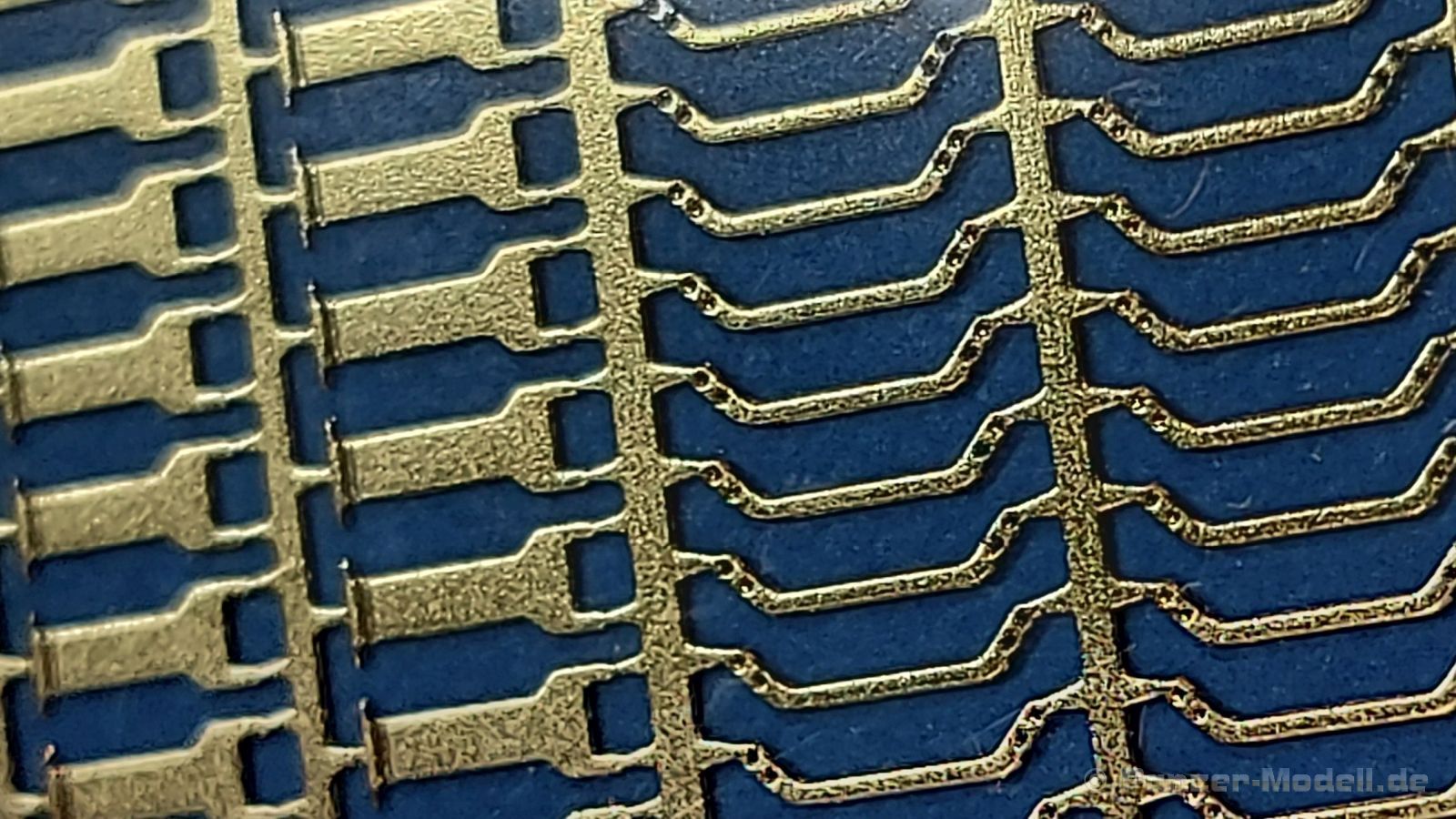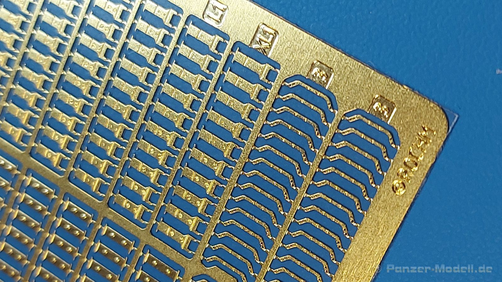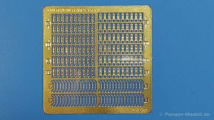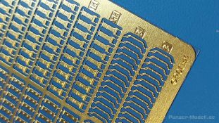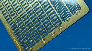 Werkzeughalterungen deutscher Panzer im 2. Weltkrieg sind an Modellen oft ans Werkzeug angegossen und grad bei älteren Bausätzen sehr einfach gehalten. Der chinesische Hersteller ROCHM bringt Werkzeughalterungen aus Photoätzteilen heraus, mit denen man die weniger guten ersetzen oder auch leere Halterungen darstellen kann. In einem 90 (115 mit Aufhänger) x 60 mm großen, wieder verschließbaren Klarsichttütchen befindet sich das PE-Set Type.B, zusammen mit einem Pappschild, das sowohl zum einen Schutz gegen unabsichtliches Verbiegen bieten soll, als auch als Konstruktionsanleitung gesehen kann. Das Set beinhaltet 180 PE Teile für 60 Halterungen. Diese teilen sich auf in 4 Arten, in Form und Größe unterschiedlich und wie folgt bezeichnet: