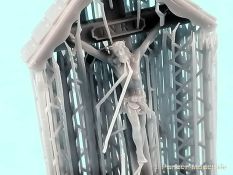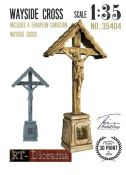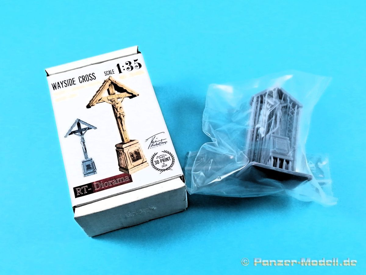 35404 Wayside Cross 1:35 Und wieder etwas Feines von RT-Diorama für unsere Dioramenfreunde. Diesmal gibt es ein richtig schön gemachtes “Wayside Cross”, zu Deutsch Wegekreuz oder auch Marterl genannt. Ein Flurkreuz (auch Weg(e)kreuz oder Feldkreuz) ist ein Kreuz an einer Wegkreuzung, einem Weg oder einer Straße, am Feldrand oder im Wald. Es kann aus Holz, Stein oder Metall bestehen. Häufig sind Flurkreuze als Kruzifixe, das heißt mit Darstellung des gekreuzigten Christus, gestaltet. Sie sind Zeichen christlichen Glaubens, die Anlässe für ihre Errichtung sind vielfältig. (Quelle: Wikipedia) Regional werden diese Flurkreuze im bayerischen Sprachraum auch als Marterl bezeichnet. Die Kartonbox beinhaltet ein einziges Druckteil in allerfeinster Ausführung. Das Wegekreuz ist mit Sockel, dem Kreuz sowie dem Dach und der Figur des gekreuzigten Heilands absolut filigran ausgeführt. An der Feinheit des Drucks können sich definitiv einige andere Hersteller ein Beispiel nehmen. Selbst winzige Details wie Dornenkronen sind zu finden. Hier kann alles überzeugen. Rund sieben Zentimeter Höhe schlagen hier zu Buche. Die Supports kommen sehr fein daher und es sollte keine Mühe sein diese zu entfernen. Eine Bereicherung für viele Dioramen…, aber auch Eisenbahnfreunde der größeren Spurweiten dürften sich an diesem Kit erfreuen. Gleichwohl spricht der Preis für sich. Absolut empfehlenswert! Erneut ein tolles Set für Dioramenbauer! Nicht nur... auch Eisenbahnfreunde der größeren Spurweiten dürften sich an diesem Kit erfreuen.