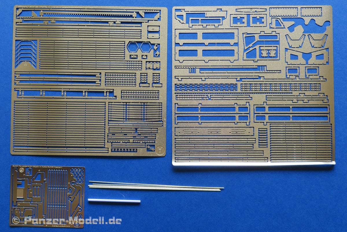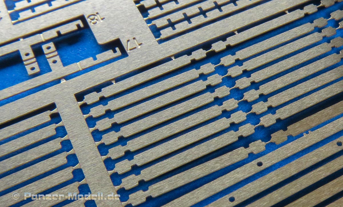 Darüberhinaus liegen Teile bei um die Auspuffendstücke auch komplett in PE ebenfalls mit einzelnen Lamellen neu aufzubauen und vor allem die neue Käfigantenne auf dem Turmdach fein und detailliert als PE Teil zu bauen.