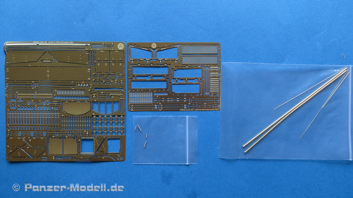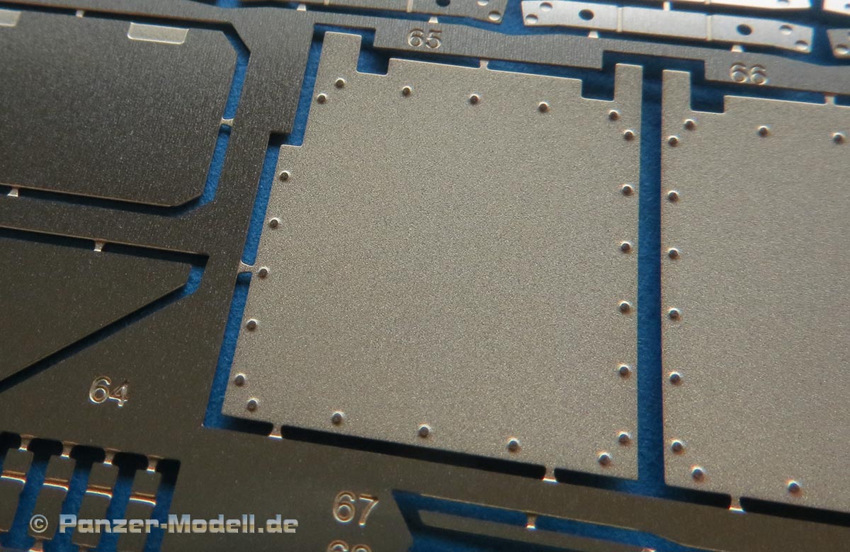 In der Hauptsache sind hier die kompletten Turmschürzen, die im Basismodell aus Plastik sind, als dünne PE Bleche, die mit weiteren Details, sowie den zweiflügeligen Türen versehen werden. Auch an den Türen sind mehrere superfeine Details anzubringen, wie etwa der Verriegelung.