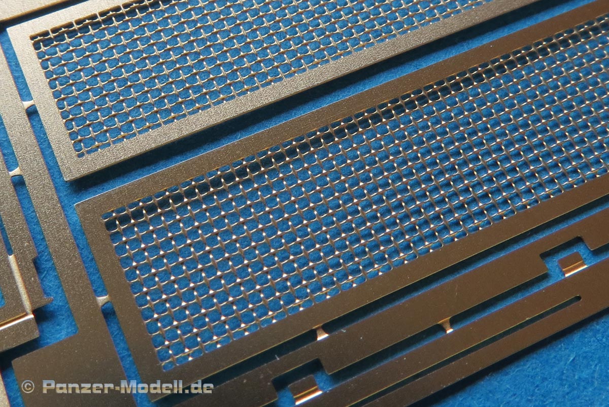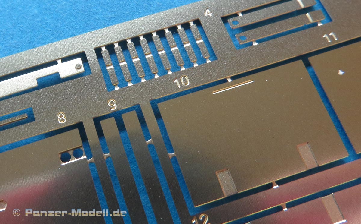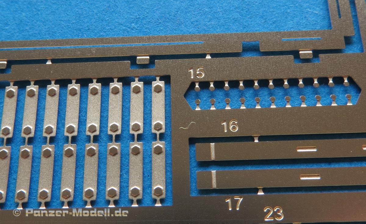 Die Qualität der PE Platinen ist hervorragend - angenehm dünnes Material, sauber und fehlerfrei geätzt. Die Federn stehen dem in nichts nach - es handelt sich um superfein gewundene Federn für die 4 klappbaren Endsrücke der Kettenbleche - daher zwei lange und zwei kurze Federn. Die Darstellung ist perfekt und besser als alles was in Plastik machbar ist.
