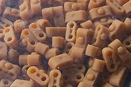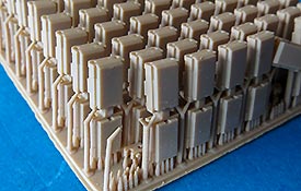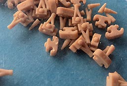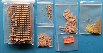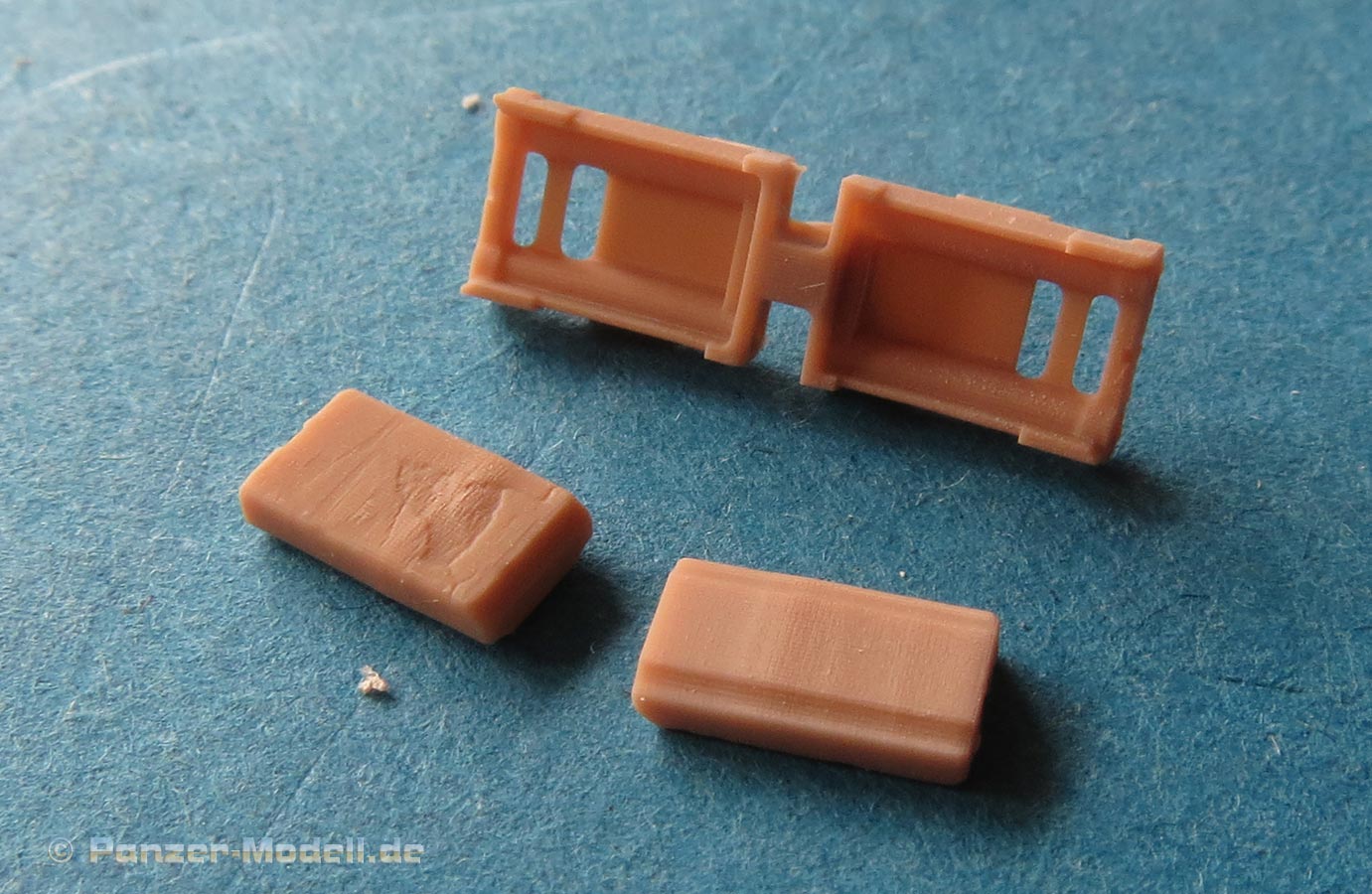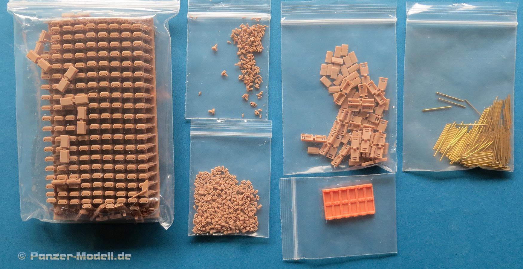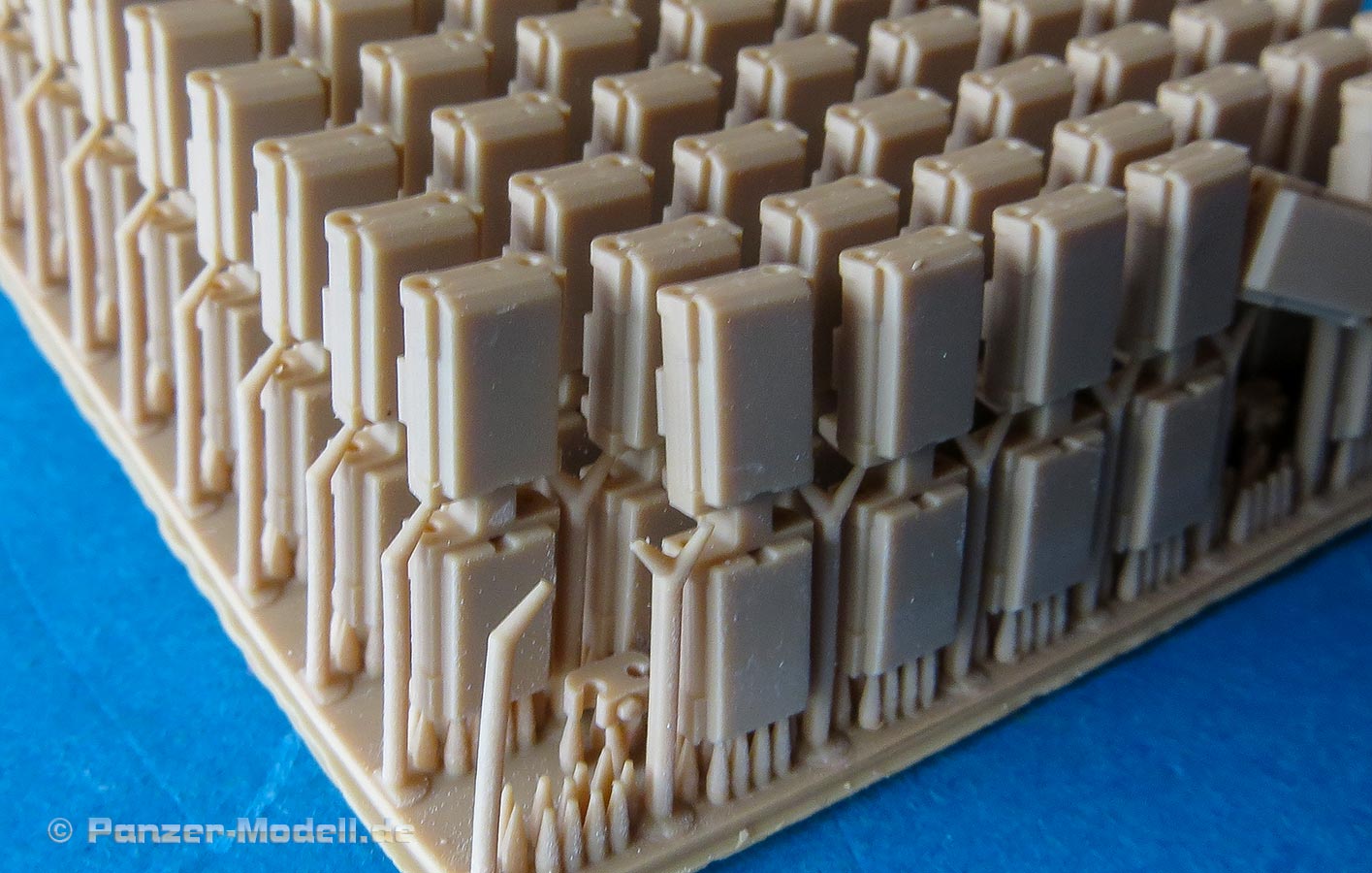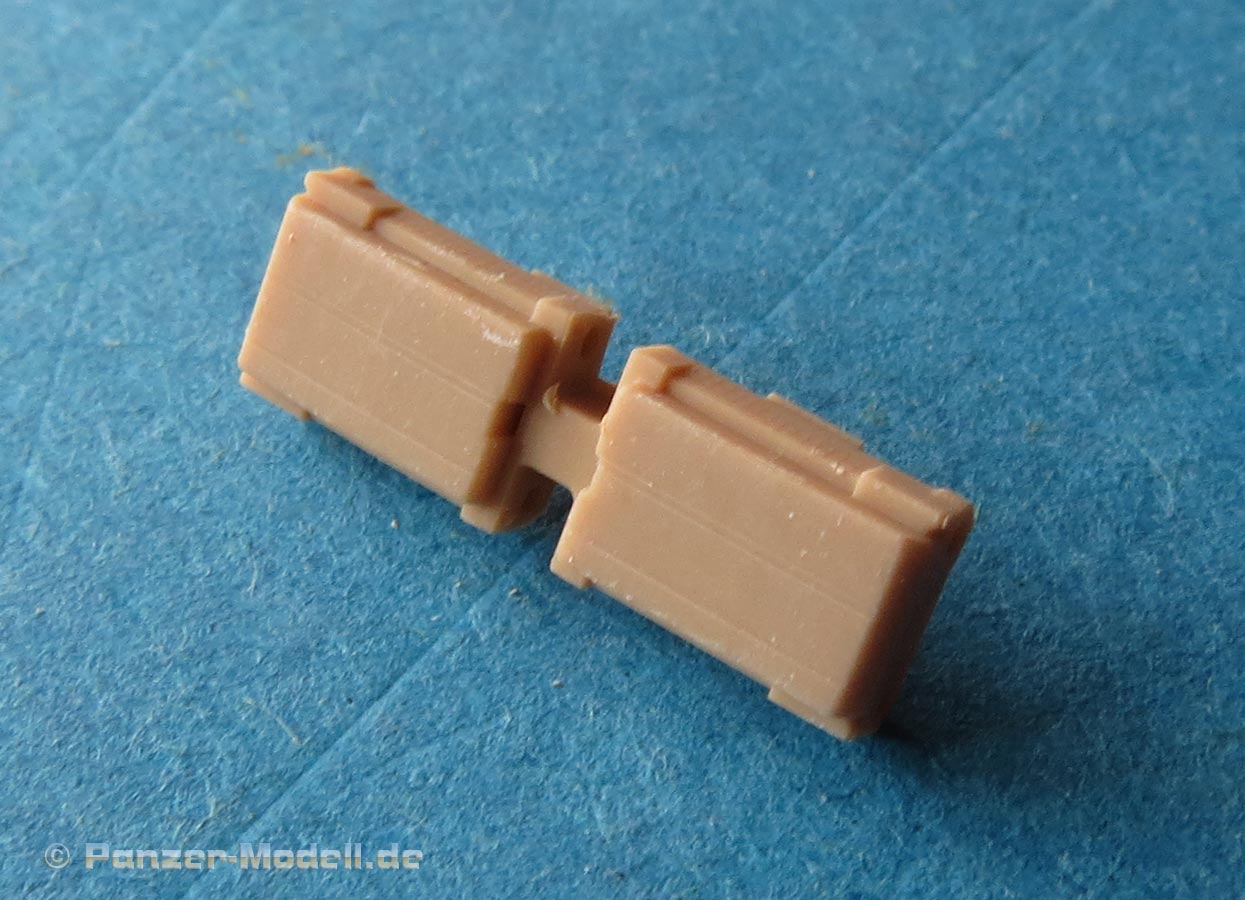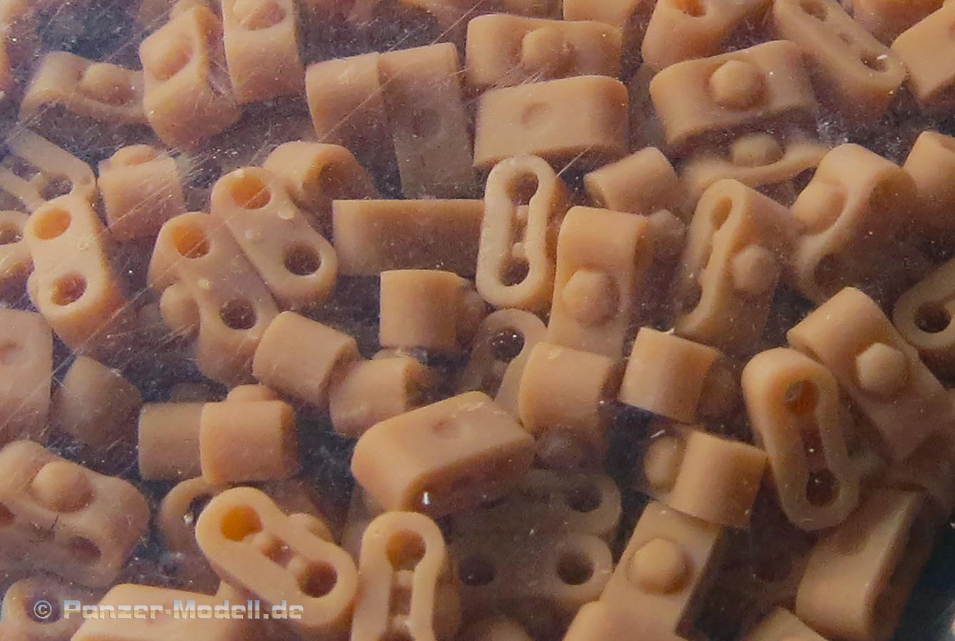 Erfreulich, dass auch für moderne Fahrzeuge, wie für die Bundeswehr auch Zubehör und Ketten auf den Markt kommen und in diesem Fall sogar 3D gedruckte Ketten mit bemerkenswerten Features. In diesem Fall handelt es sich um die Diehl 570P Kette für die modernen Raubkatzen der Bundeswehr. Im Karton finden wir sechs Beutel mit Einzelkettengliedern, Endverbindern, Mittelverbindern, Metallstiften, Extragliedern und einer Bauhilfe. Der Druck ist ganz exzellent. Sauber und mit scharfen Details sind die Kettenkörper in einem Stück gedruckt und sitzen mit einer Schmalseite auf einem riesigen Angusstück, das knapp 180 Kettenglieder enthält. Beim Abtrennen der Stützstrukturen muss man etwas vorsichtig vorgehen und die Kettengleider auf keinen versuchen einfach abzubrechen, denn das kann auch irgendwo mittendrin brechen. Und vorsicht - nahezu unsichtbar zwischen den Kettengliedern sind am Boden der Angussplatte noch Mittelverbinder gedruckt, die dann auch noch vorsichtig entfernt werden wollen. Die Glieder werden mit einem passenden Metallstift miteinander verbunden, bzw. sind es ja tatsächlich zwei, die zwei Glieder mit Endverbindern und dem Mittelverbinder dann beweglich miteinander verbinden, so wie beim Original. Für den Zusammenbau liegt eine gedruckte Bauhilfe bei in der immer 6 Glieder eingelegt und dann zusammengesteckt werden können. Der Preis ist sicher kein Pappenstiel, aber angesichts der 3D Drucktechnik und deren aktueller Kosten plus der vorgeschnittenen Metallbolzen ein vertretbarer Preis - muss nur jeder für sich entscheiden welches Detaillevel einem das Leopardmodell für welche Kosten wert ist.