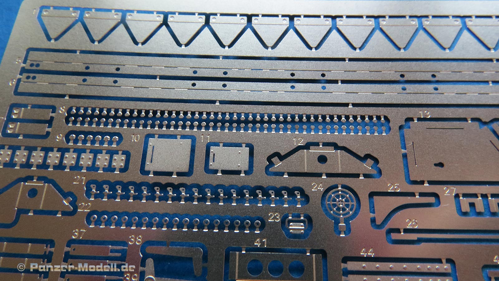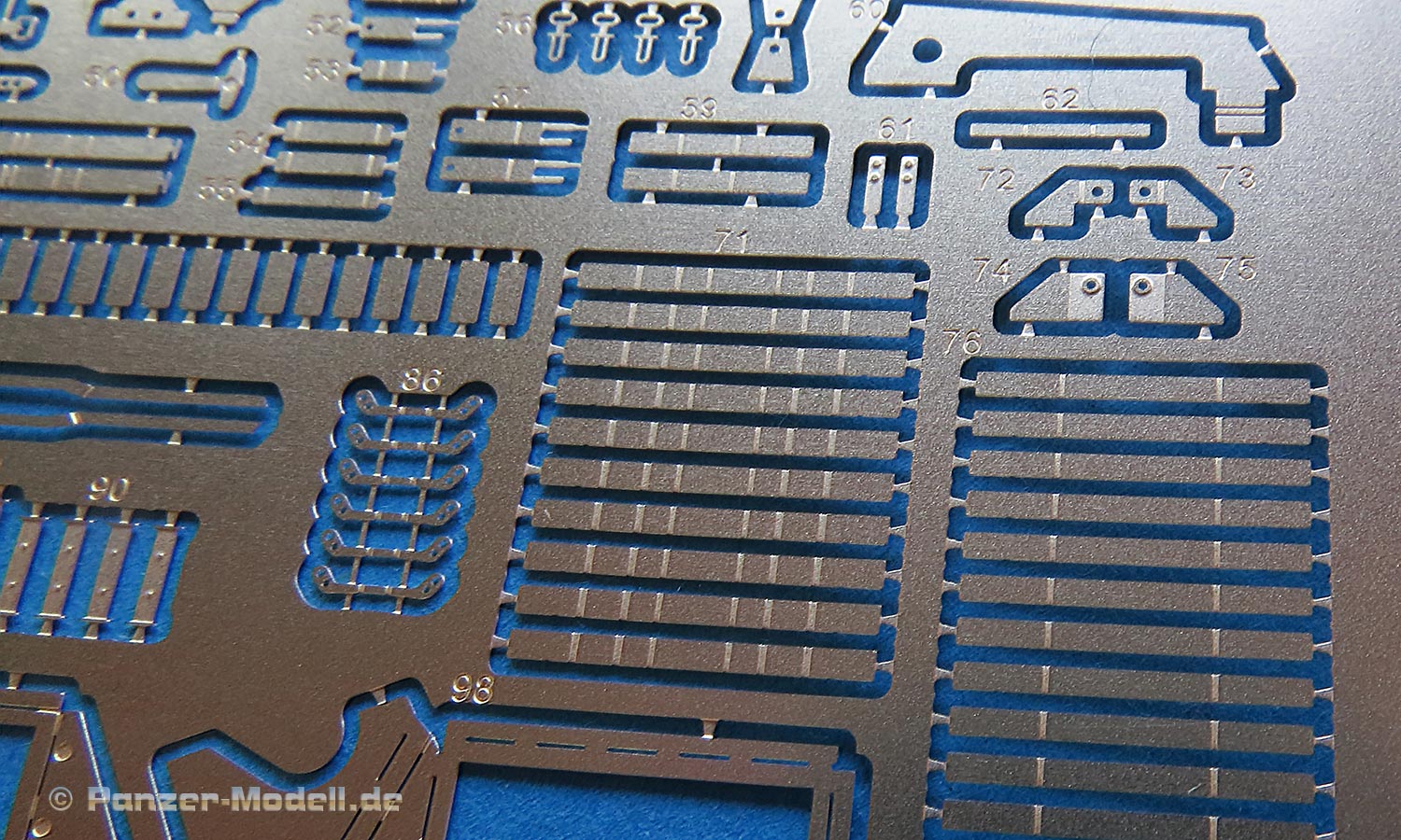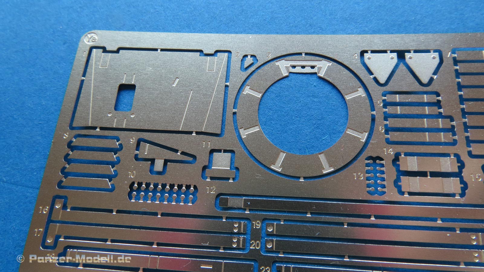 In der Hauptsache finden wir bei den PE Teilen sämtliche Werkzeughalterungen, Ersatzkettengliederhalterungen, Antennenbasen, Front- und Heckteile der Kettenbleche, Staukiste der Ersatzlaufrollen, das MG Schild und sämtliche Halterungen und Bleche der Seitenschürzen.