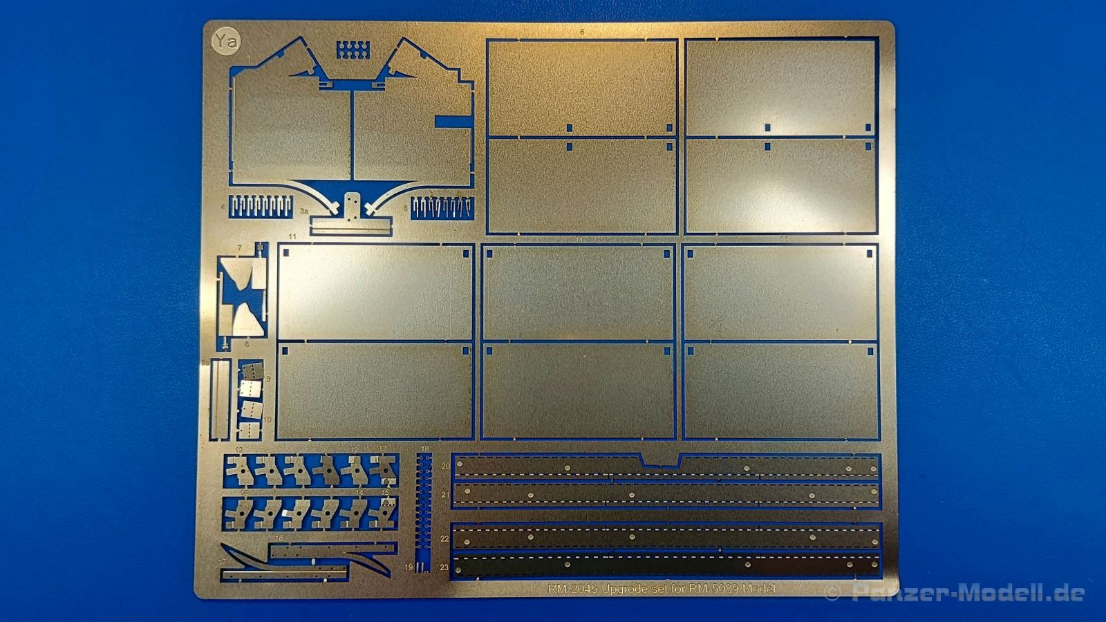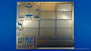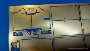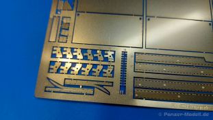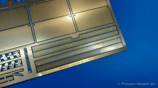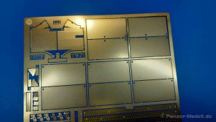 Für die Rye Field Model Panther Ausf. F und G, die ohne Kettenschürzen daherkamen/kommen, bringt die Firma nun ein Upgrade-Set heraus, mit dem man diese Modelle umgestalten kann. Im 150 x 130 x 25 mm großen Karton mit Seitenlasche befindet sich ein wiederverschließbares Plastiktütchen mit einer großen Fotoätzteil-Platine und einer Bauanleitung. Zum weiteren Schutz ist die Platine mit einer dicken Pappe hinterlegt. Die 0,15 mm starke Platine enthält die schmalen Seitenstege, die einzelnen Schürzenbleche plus Halterungen und Riegel, sowie die vorderen Schutzbleche. Die markanten Versteifungsrippen der Schutzbleche müssen noch per Kugelschreiber auf einer mittelharten Unterlage (z.B. Schneideunterlage) eingeprägt werden. Wer das richtig macht, hat hier tolle Möglichkeiten - insbesondere man diese Bleche beschädigt darstellen möchte. Da die Rye Field Panther G Modelle gar keine Schürzenelemente haben, bieten diese PE Teile sich an, die Optik eines solchen Modells grundlegend zu verändern. Man hat zum einen maßstäblich dicke Elemente, die man hervorragend beschädigen kann und zum anderen kann man sie nach Belieben einzeln einhängen und so fehlende Schürzen am Panzer darstellen. Ein A4 große, zweiseitige Bauanleitung gibt an, wie die Teile anzubringen sind. Allerdings haben sich dort kleine Fehler in Form von Falschbenennungen eingeschlichen. Die Teile unterscheiden sich aber anhand der Form deutlich und wären auch ohne Benennung zu finden.