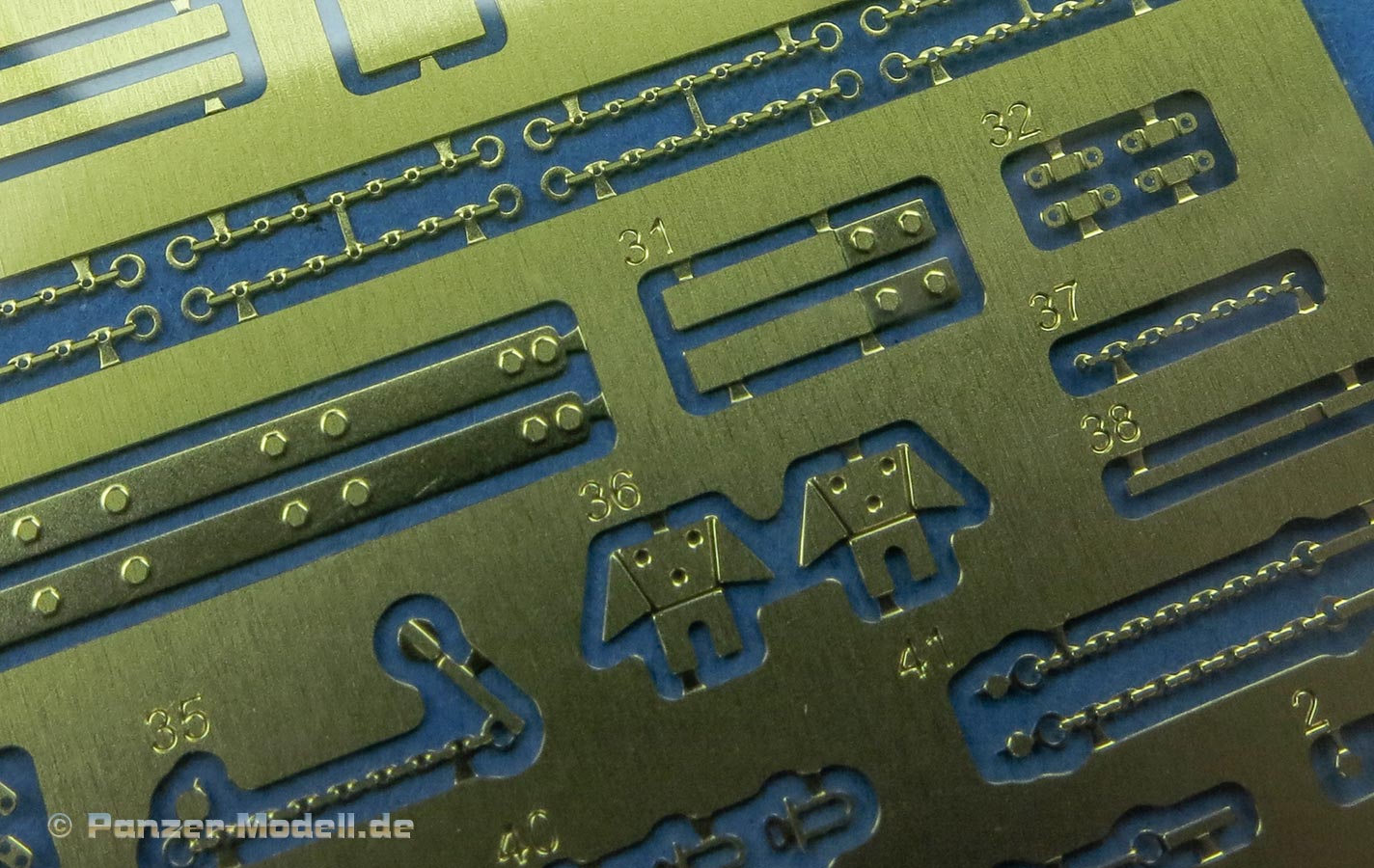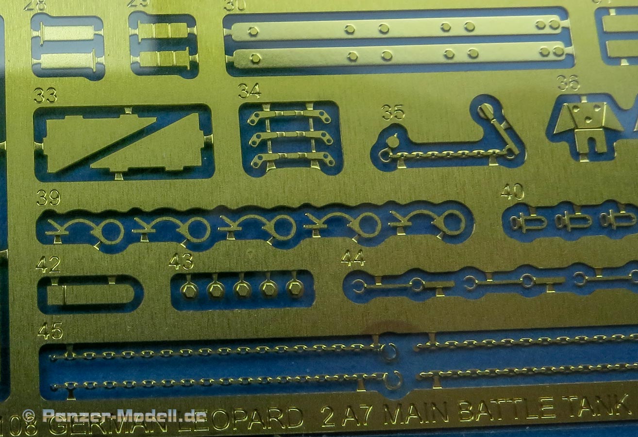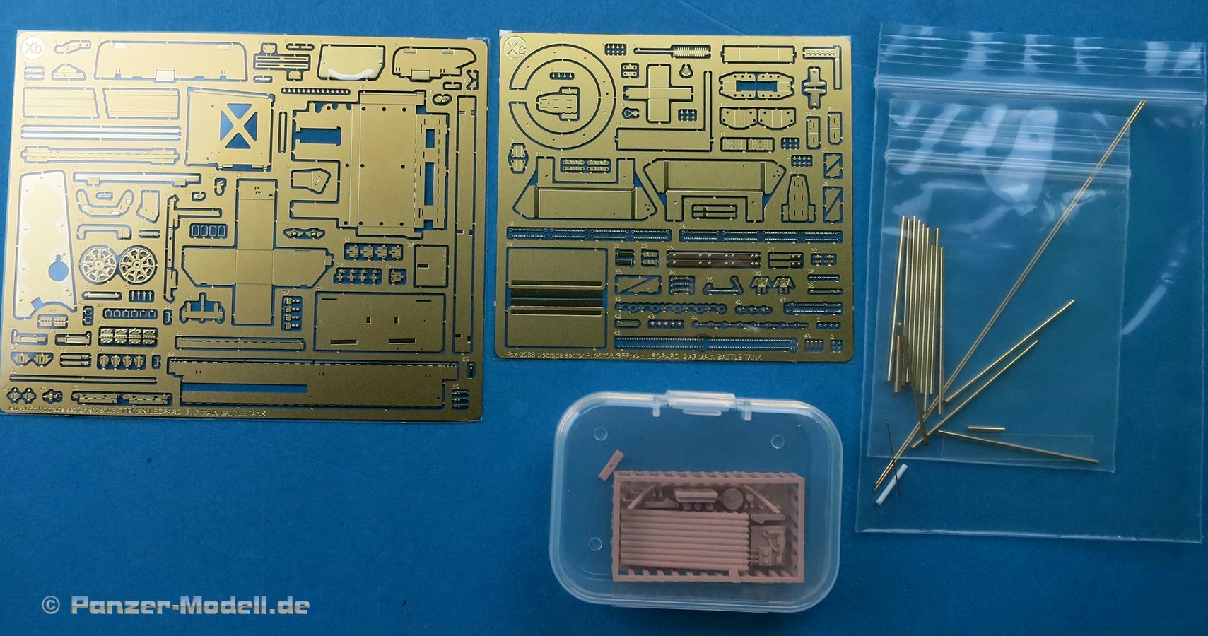 Wer einen Leopard 2 A7 von Ryefield sein eigen nennt und diesen noch ultimativ detailtechnisch verfeinern will, wird an diesem Upgrade Set aus dem Hause Ryefield nicht herumkommen In der typischen Verpackung finden wir 2 PE Platinen, verschiedene Messingstangen und eine Druckplatte mit 3D Druckteilen. Die Bauanleitung besteht aus insgesamt 9 DIN A4 Seiten - die Baustufen zeigen sauber und exakt welche PE Teile wo ergänzt oder ersetzend angebaut werden müssen. Dazu wird erfreulicherweise genau angesagt in welchem Bauschritt der Originalanleitung die jeweiligen PE Arbeitsschritte anliegen. Insgesamt ein spannendes Set, das noch einen guten Schwung mehr Deatils an bereits gute Modell bringt - man muss aber auch Muße und Können dafür haben, daher für Anfänger nicht wirklich geeignet.