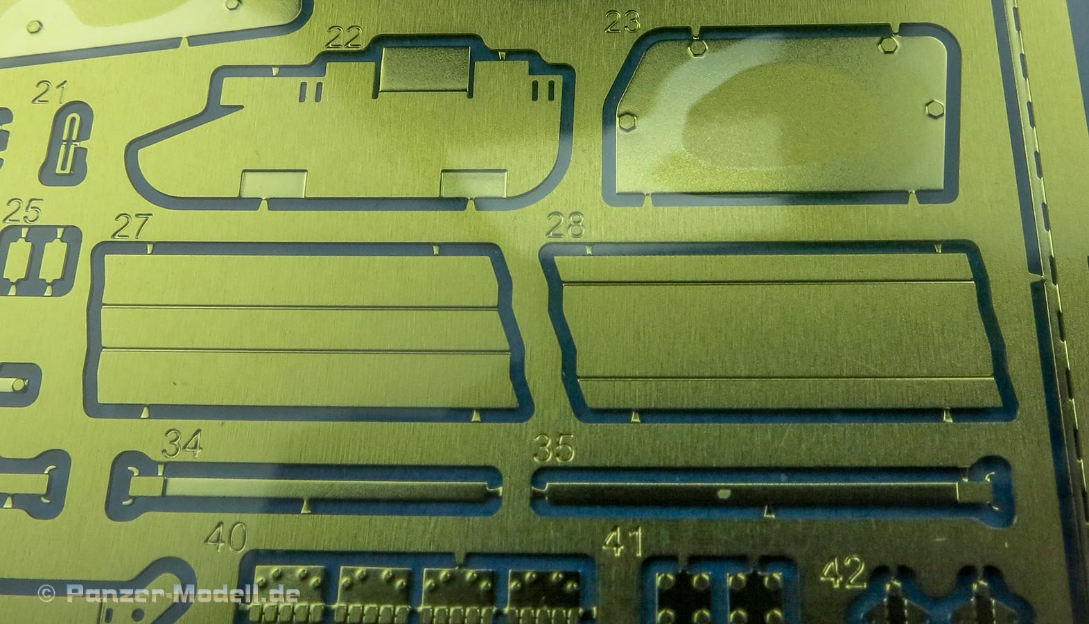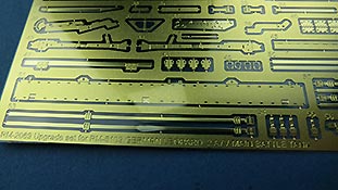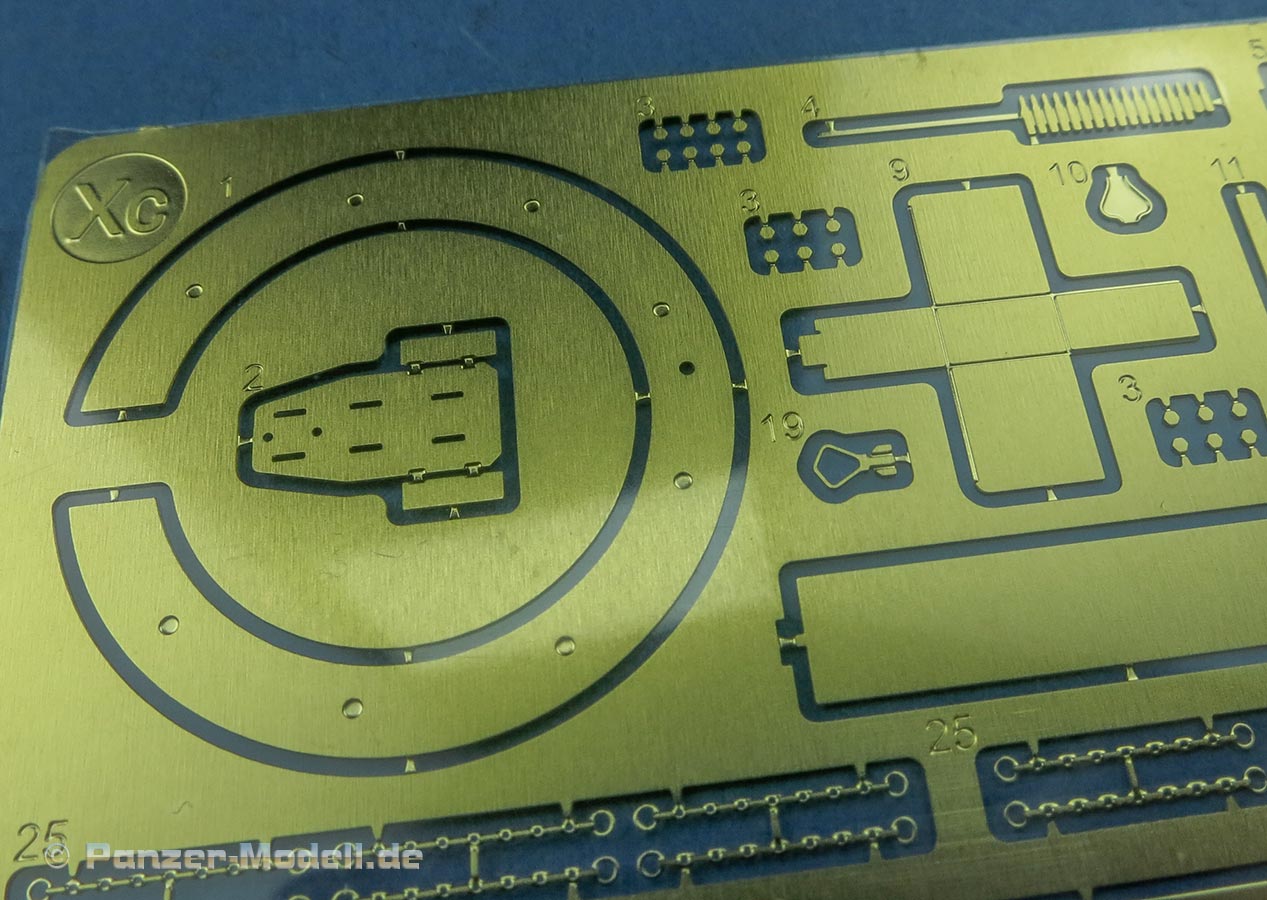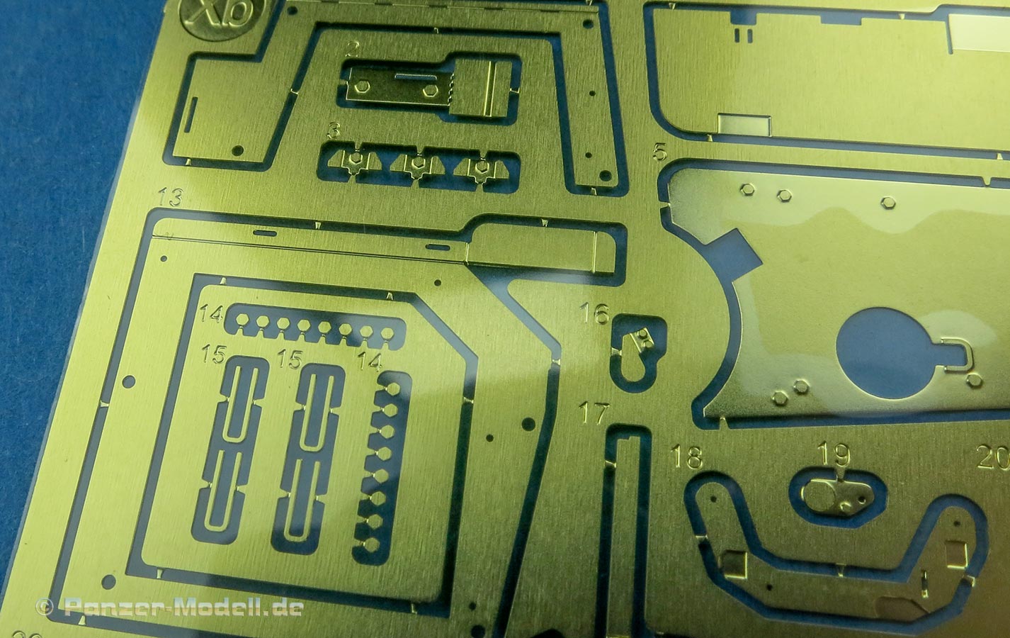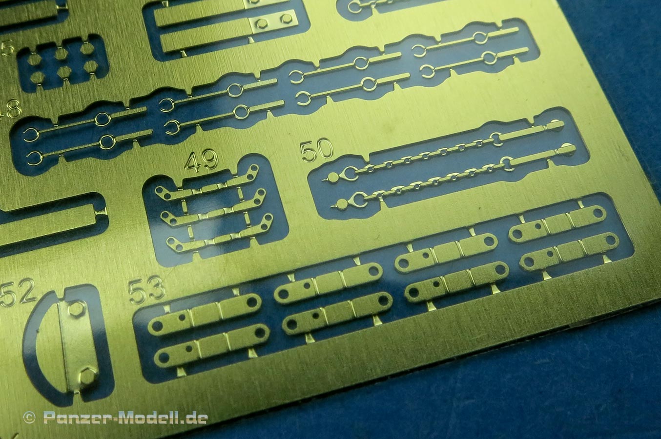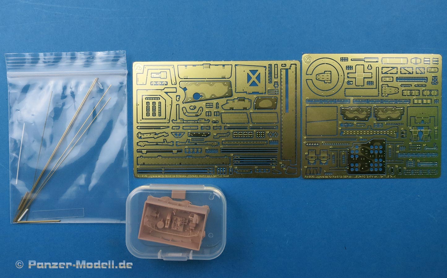 Für den Leopard 2 A7V von Ryefield gibt es aus dem eigenen Haus ein passendes Upgrade Set um dem bereits schönen Buasatz noch weiter zu verfeinern. In der typischen Verpackung finden wir 2 PE Platinen, verschiedene Messingstangen und eine Druckplatte mit 3D Druckteilen. Die Bauanleitung besteht aus insgesamt 10 DIN A4 Seiten - die Baustufen zeigen sauber und exakt welche PE Teile wo ergänzt oder ersetzend angebaut werden müssen. Dazu wird erfreulicherweise genau angesagt in welchem Bauschritt der Originalanleitung die jeweiligen PE Arbeitsschritte anliegen. Insgesamt ein schönes Set, das noch einen guten Schwung mehr Details an das bereits gute Modell bringt - man muss aber auch Muße und Können dafür haben, daher für Anfänger nicht wirklich geeignet.