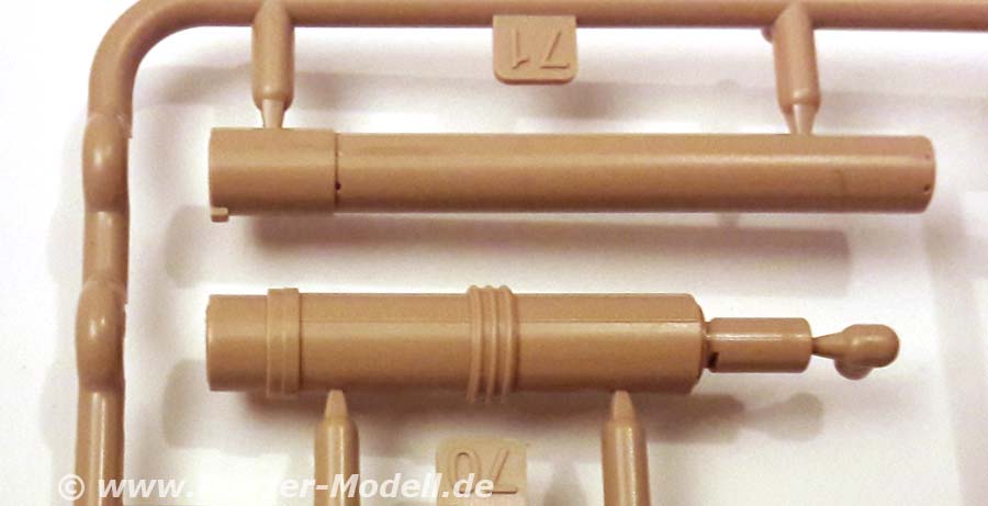 Die M256 Kanone ist nicht wie meistens üblich in 2 Hälften geteilt, sondern befindet sich bereits Rund am Spritzling und wird aus 5 Teilen zusammengebaut das ergibt im Endeffekt ein schön rundes Kanonenrohr ohne störenden Nähte, die verspachtelt werden müssten. Auch das M2 Maschinengewehr wird ähnlich zusammengebaut, und so entsteht ein schöner realistischer Effekt.