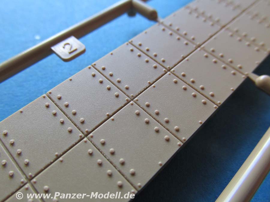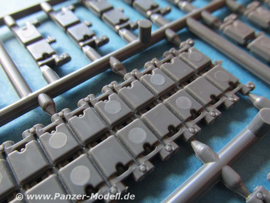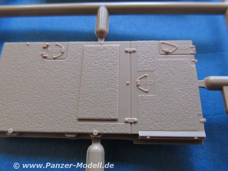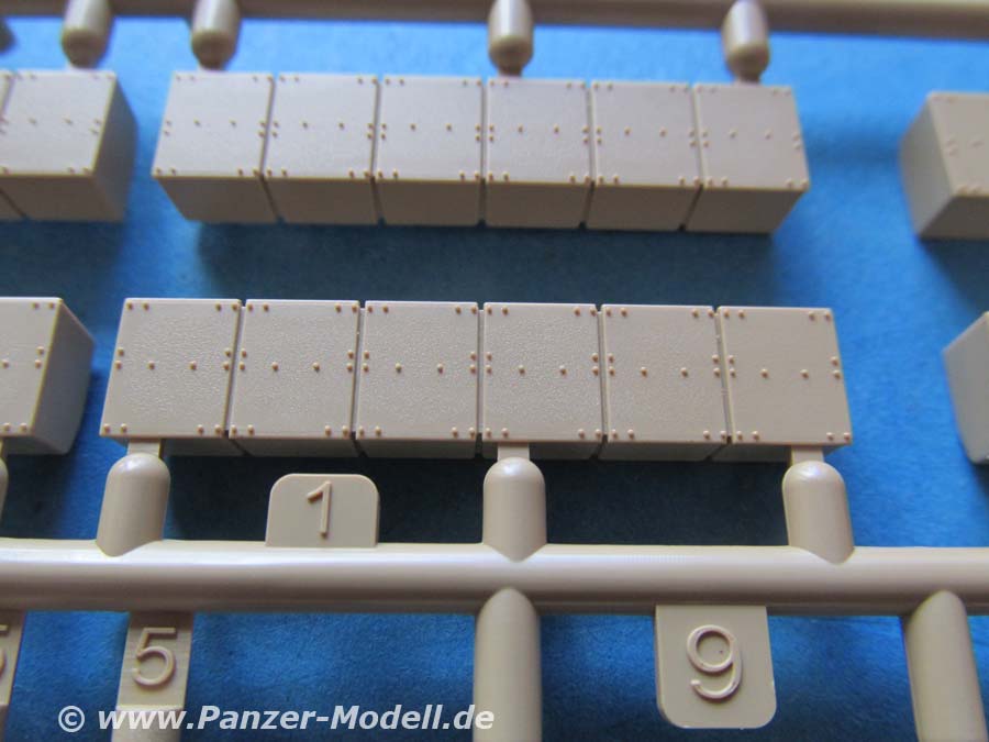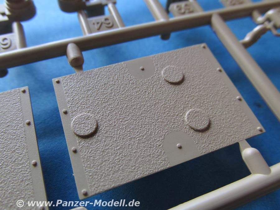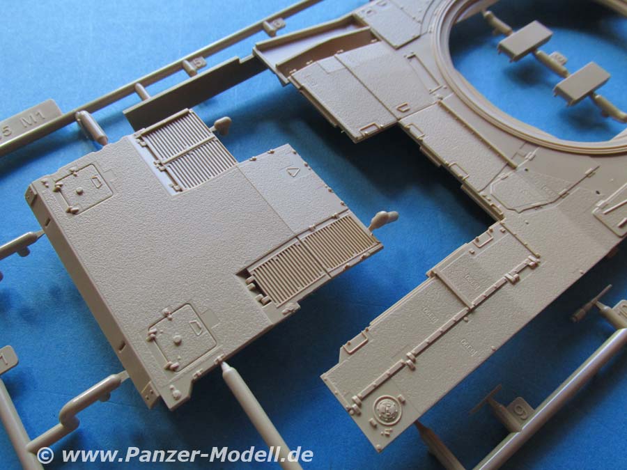 Die Detailierung macht einen ganz hervorragenden Eindruck mit feinen, sauberen und scharfen Details an allen Teilen. Was bei Durchsicht der Teile gleich angenehm ins Auge fällt und im bereich der modernen Panzerfahrzeuge ein wichtiges, optisches Detail ist an dem man die Qualität des Bausatzes ausmacht, sind die Antirutschbeschichtungen, die hier auf allen wichtigen Oberflächen recht gut und ansprechend direkt mit aufgeprägt ist.