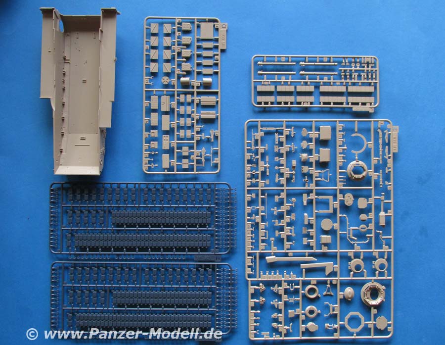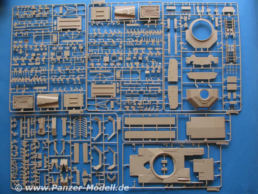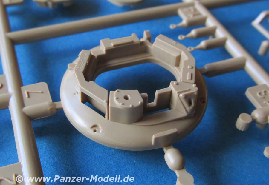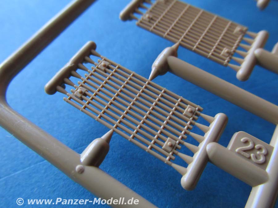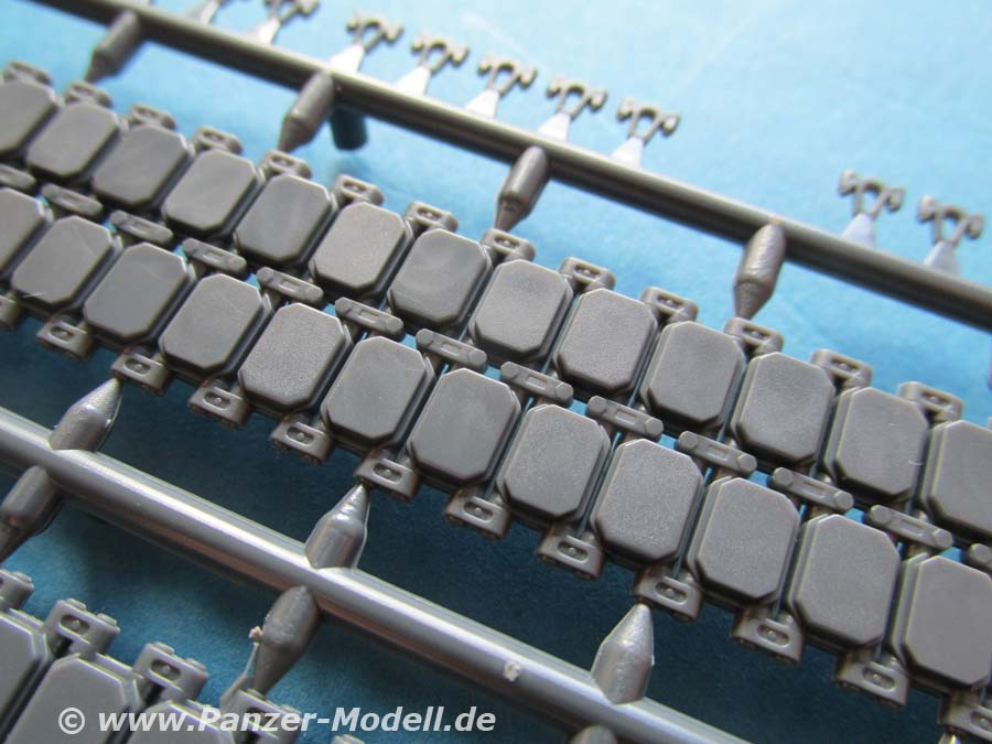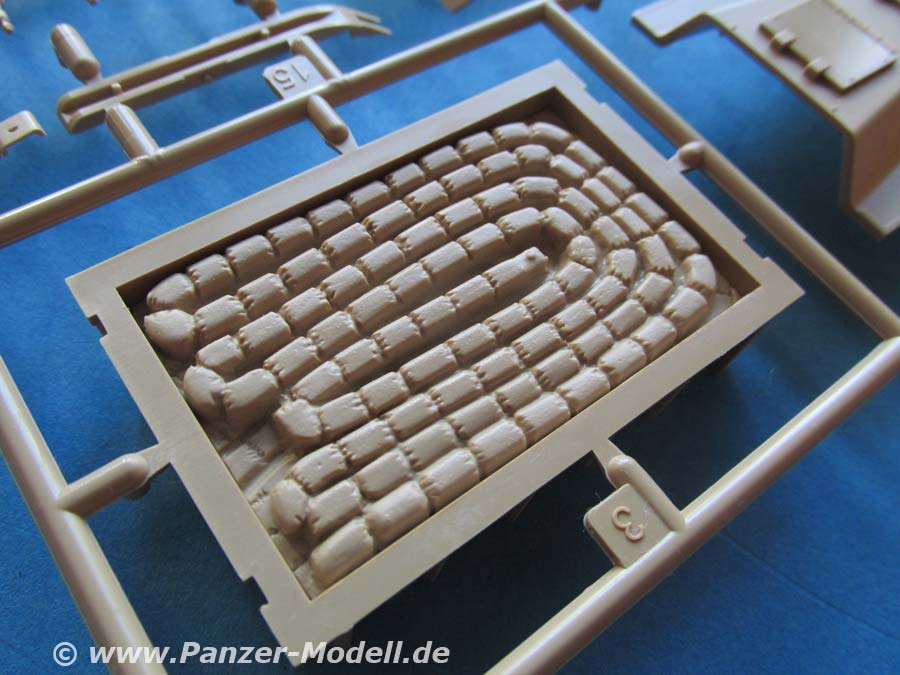 Die Detailierung macht einen ganz hervorragenden Eindruck mit feinen, sauberen und scharfen Details an allen Teilen. Was bei Durchsicht der Teile gleich angenehm ins Auge fällt und im bereich der modernen Panzerfahrzeuge ein wichtiges, optisches Detail ist an dem man die Qualität des Bausatzes ausmacht, sind die Antirutschbeschichtungen, die hier auf allen wichtigen Oberflächen recht gut und ansprechend direkt mit aufgeprägt ist.