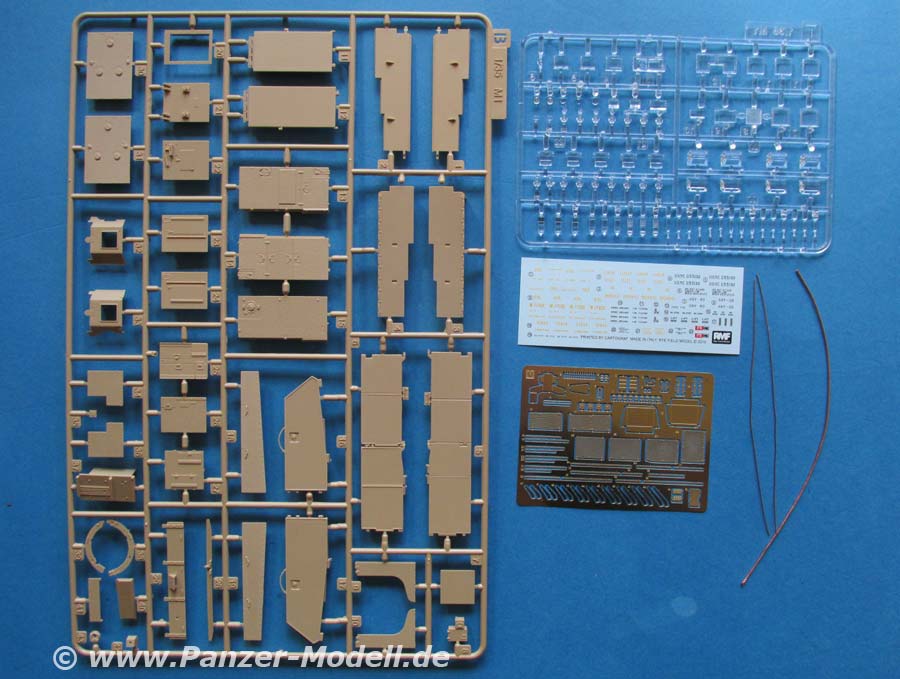 Im Bausatz finden wir 14 sandgelbe, zwei graue und einen transparenten Spriitzling sowie der Unterwanne, einer PE Platine, ein Decalbogen und Drahtmaterial.