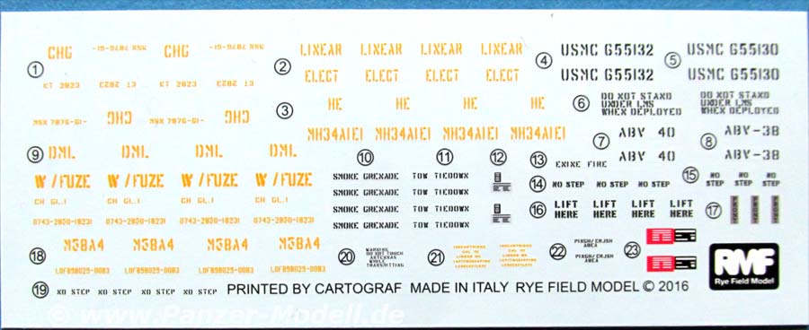 De sauber gedruckte Decalbogen enthält in der Hauptsache allgemeine Markierungen, wie Servicehinweise am Panzer und speziellen markierungen einzelner Fahrzeuge.