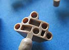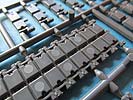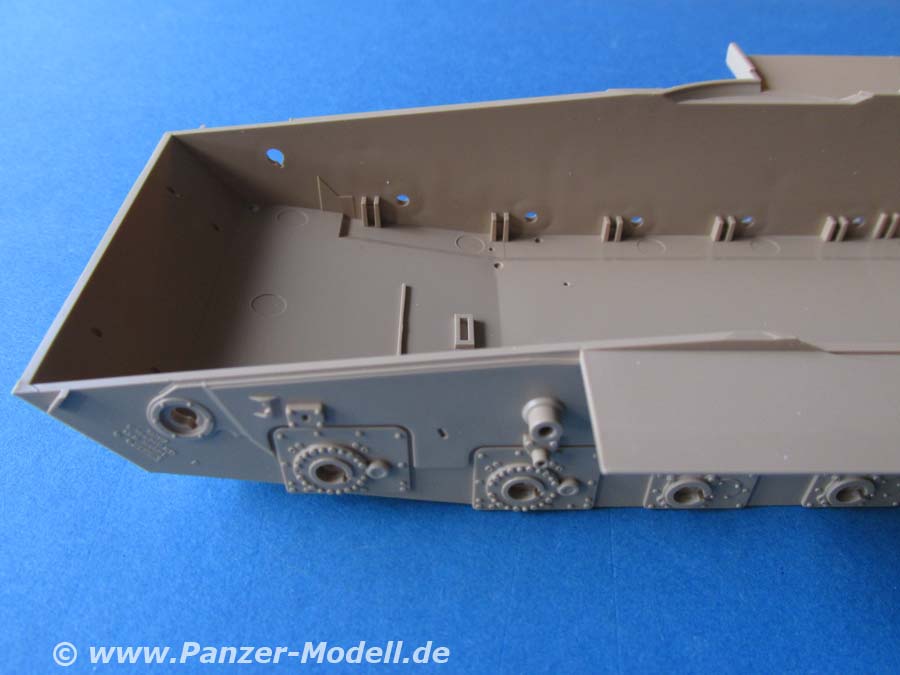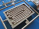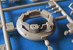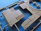 Die Wanne ist soweit einteilig und wird natürlich mit Einzelteilen weiter verfeinert. Hier müssen für diese Version auch einige Löcher aufgebohrt werden, unter anderem zum Anbringen der neuen Minenschutzplatte unter dem Wannenboden. Das Laufwerk wird mit einzeln einsteckbaren Drehstäben und daran anzuklebenden Schwingamen gebaut, was zu einem beweglichen Laufwerk führen soll. Wenn man die Kette aus dem bausatz nimmt, kann man die Schwingarme ruhig verkleben, denn die Kette besteht aus Segmenten, d.h. da bewegt sich gar nichts. Die Darstellung als Segmentkette ist ein guter Kompromiss zwischen schneller Baubarkeit und einem hohen Detailgrad, zumal hier die Führungszähne noch einzeln angebracht werden müssen. Leider zeigt die vorliegende Kette hier auf der Innenseite ein paar Auswerfermarken und sie krankt an einem Phänomen, das man bei vielen Ketten moderner fahrzeuge im Modellbau findet: Die Endverbinder sind oft bereits an einer Seite fest angegossen - auf geraden Stücken kein Problem. Beim Umlauf um Leit. und treibrad müssen diese aber an beiden Gliedern gleichmäßig abgewinkelt sein - hier leider nicht so.