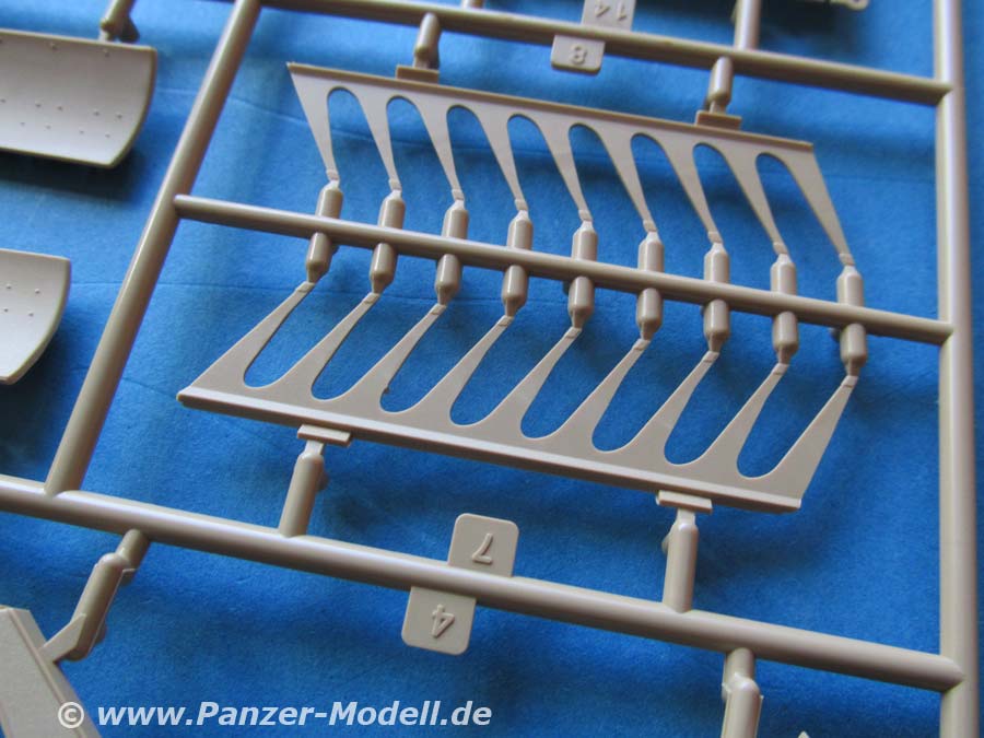 Optisches Highlight und insgesamt schon fast ein Bausatz für sich dürfte der Pearson Minenpflug sein, der vorn am Bug angebracht wird. DIe Teile für den Pflug sind alle sehr schön und sauber gespritzt und, soweit aus der Bauanleitung ersichtlich, auch in der Höhe beweglich baubar. Insgesamt erstaunlich viele und erstaunlich kleine teile, die zudem noch mit einigen sehr feinen und filigranen PE Teilen verfeinert werden - definitiv kein Bausatz den man mal eben schnell baut.