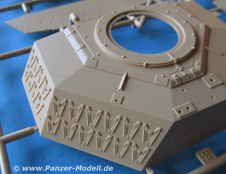 Der Turm ist ebenfalls komplett neu. Hier wird die Vorderseite mit einzelnen Segmenten an Reaktivpanzerungsblöcken versehen, die einen sehr guten Eindruck machen. Auch die Kommandantenkuppel mit dn einzelnen Winkelspiegeln aus klarem Plastik und dem 12,7mm Browning MG macht einen ausgezeichneten Eindruck.
