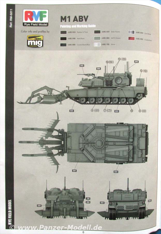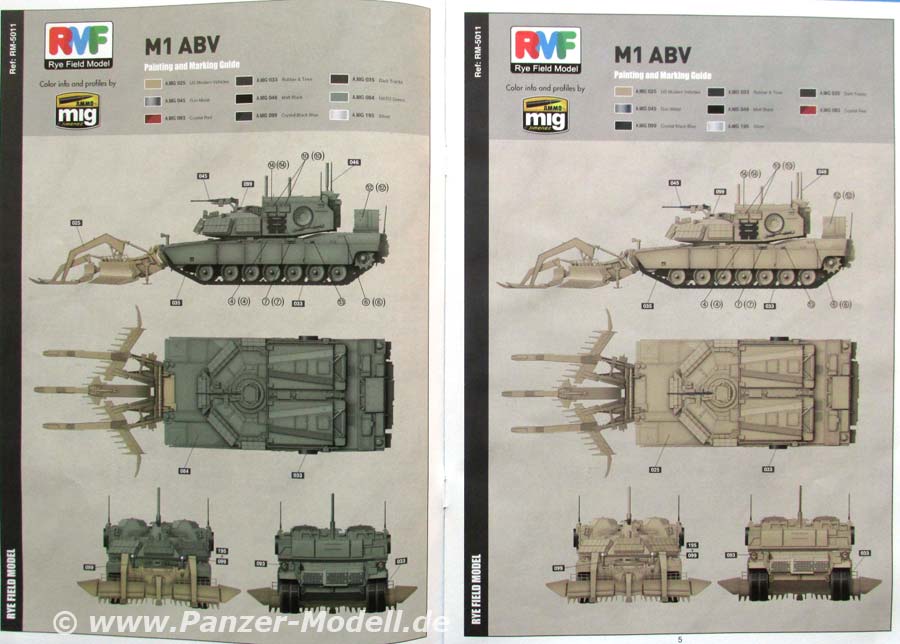 In der Anleitung finden sich drei farbig gedruckte Vierseitenansichten mit Bemalungs- und Markierungsvorschlägen. Die Farbangaben beziehen sich auf Amig Farben