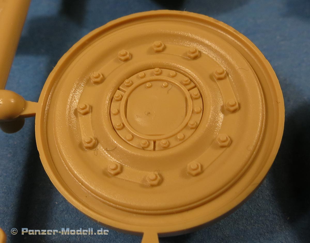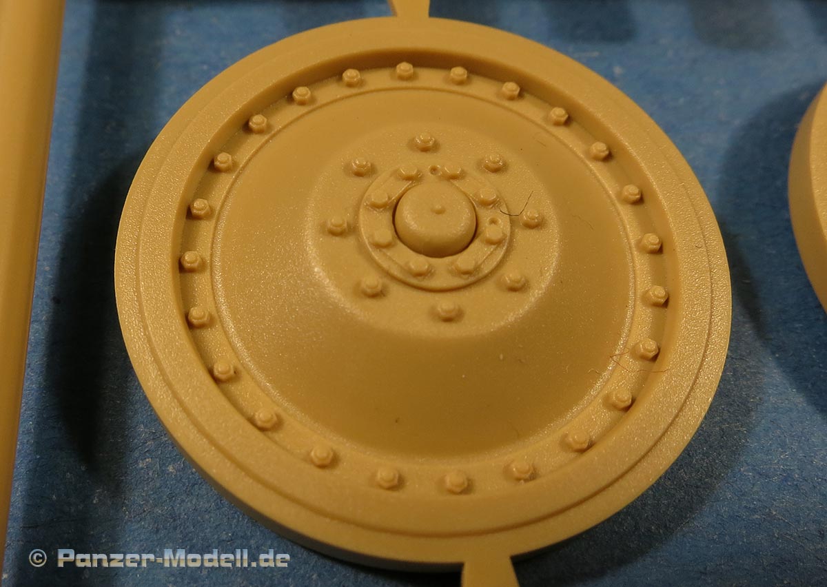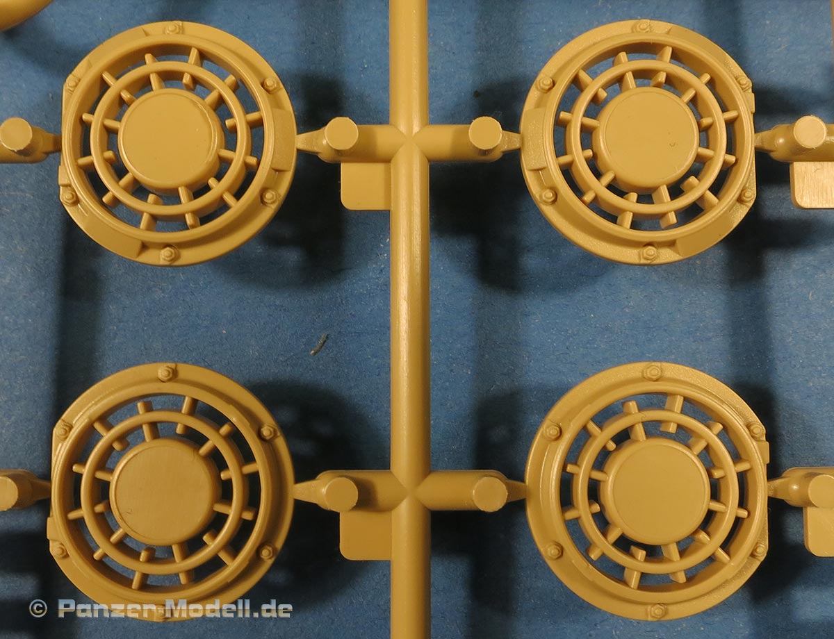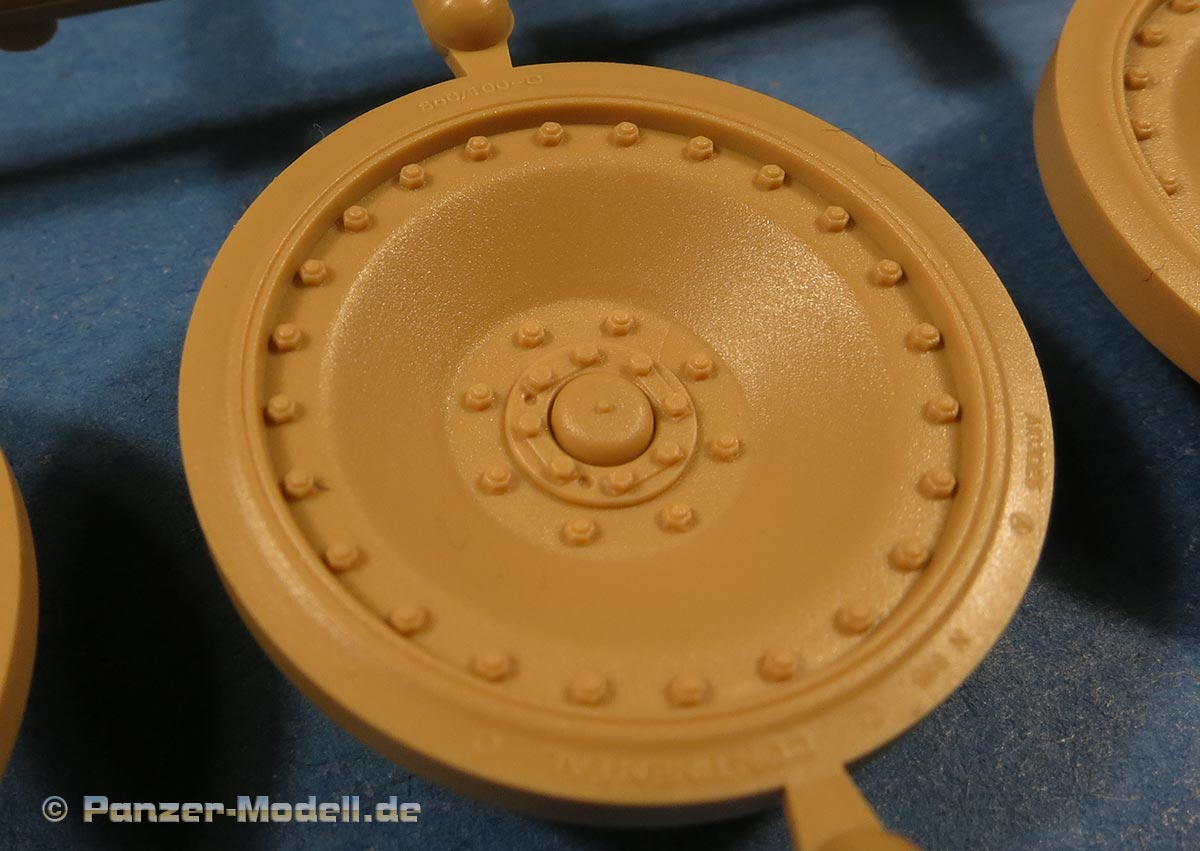 Die Laufrollen machen einen hervorragenden Eindruck mit sehr feinen Details der Radmuttern und Gummierung mit ultrarealistischen Herstelleraufdrucken. Zusätzlich gibt es 2 Stahllaufrollen für die letzten Radstation, sowie Laufrollen ohne Gummierung, bzw. aufsteckbarer Gumierung aus schwarzem Weichplastik. So können beschädigte Laufrollen ohne Gummierung darstellen und auch die äusseren Laufrollen können abgenommen dargestellt werden, da die Radaufnahmen als Detailteile enthalten sind.