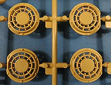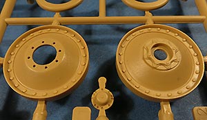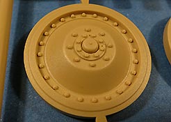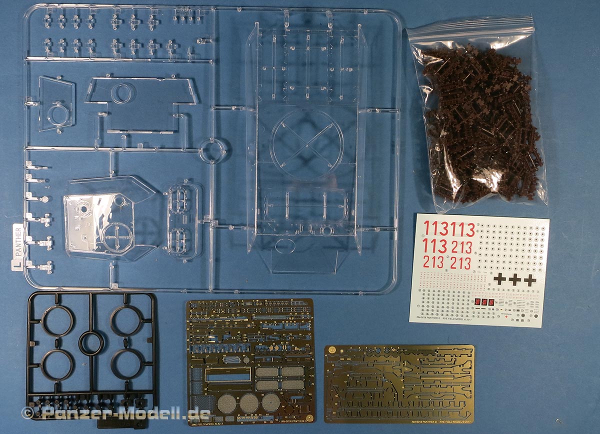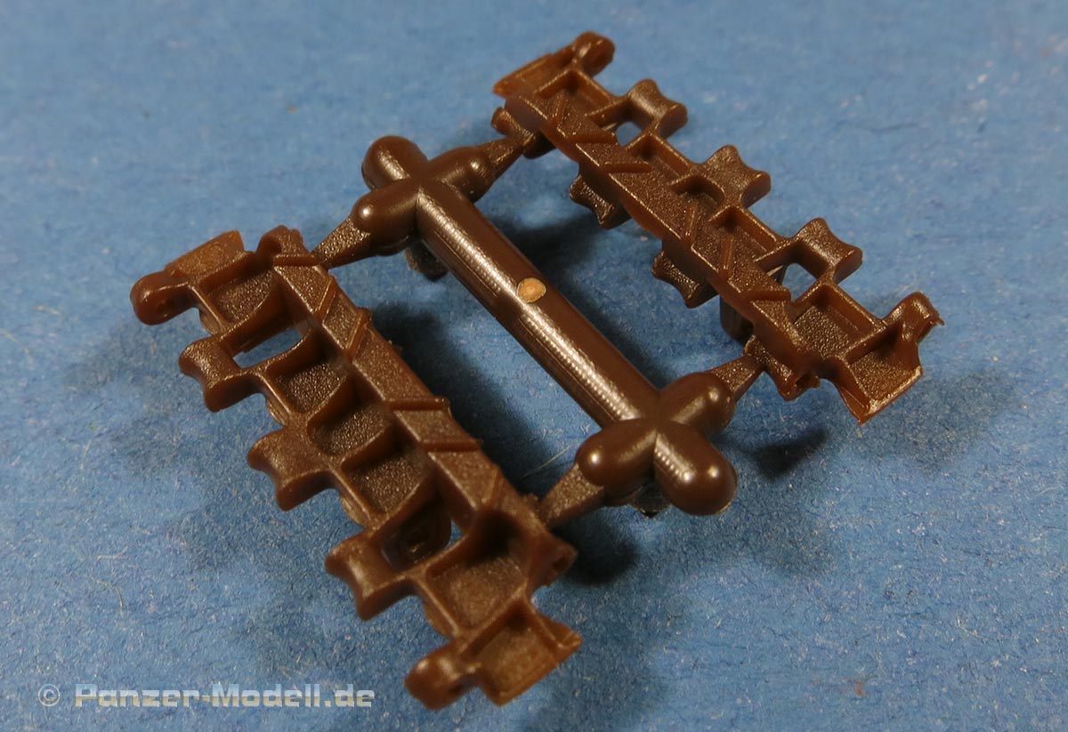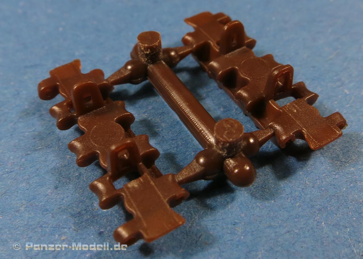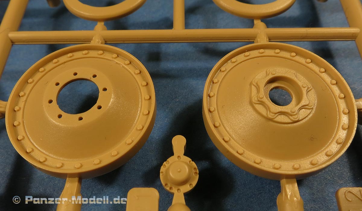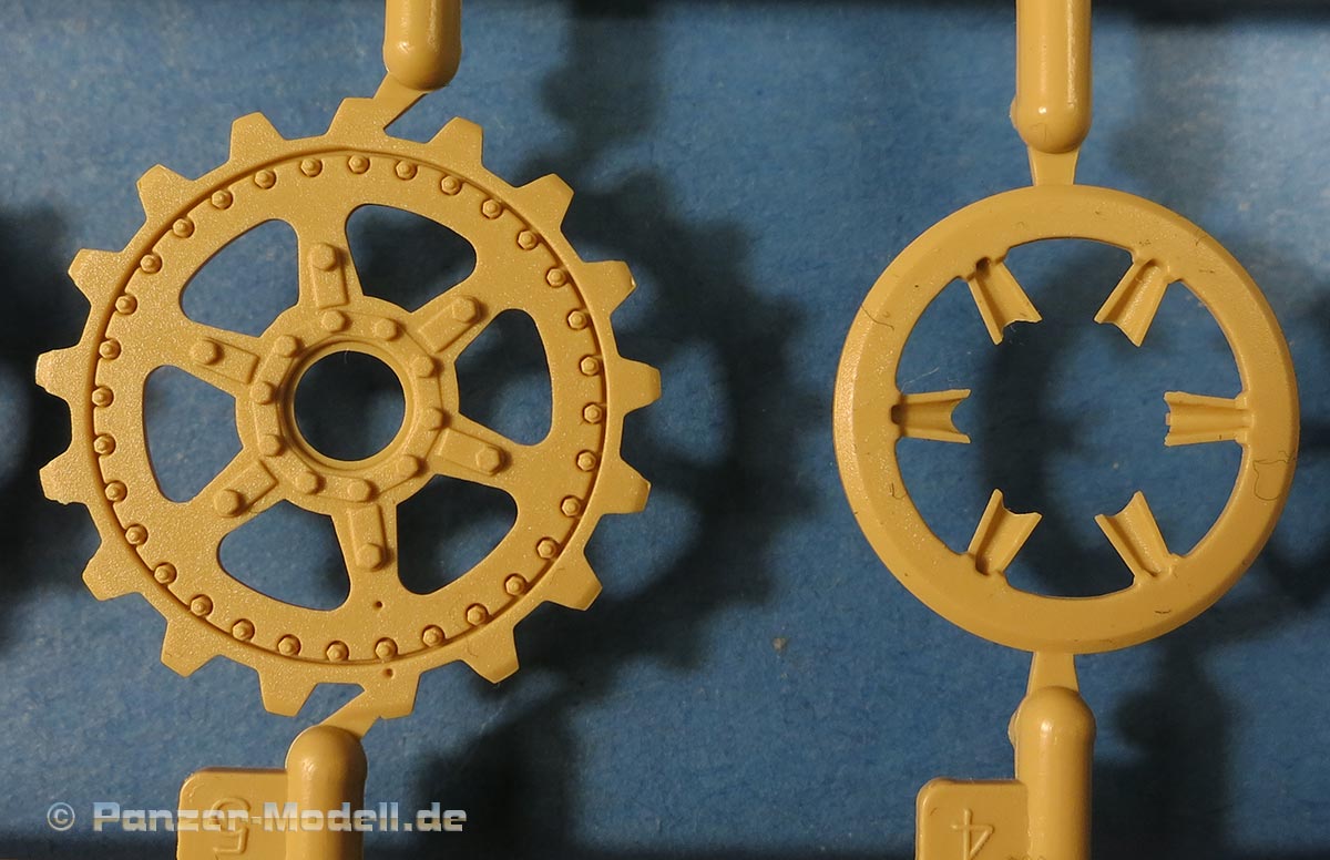 Die Laufrollen machen einen hervorragenden Eindruck mit sehr feinen Details der Radmuttern und Gummierung mit ultrarealistischen Herstelleraufdrucken. Zusätzlich gibt es 2 Stahllaufrollen für die letzten Radstation, sowie Laufrollen ohne Gummierung, bzw. aufsteckbarer Gumierung aus schwarzem Weichplastik. So können beschädigte Laufrollen ohne Gummierung darstellen und auch die äusseren Laufrollen können abgenommen dargestellt werden, da die Radaufnahmen als Detailteile enthalten sind.