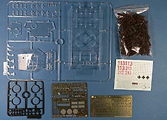 In dem recht großen Bausatzkarton finden wir 12 sandgelbe, einen transparenten und einen schwarzen Spritzling sowie eine Tüte Einzelgliedern, zwei PE Platinen, verdrillte Metallkabel und ein Decalbogen. Der transparente Spritzling (mit glasklaren Teilen) ist in dieser Form nur in der Erstauflage enthalten und wird in dem nächsten Produktionlos durch einen in sandgelbem Plastik ersetzt.