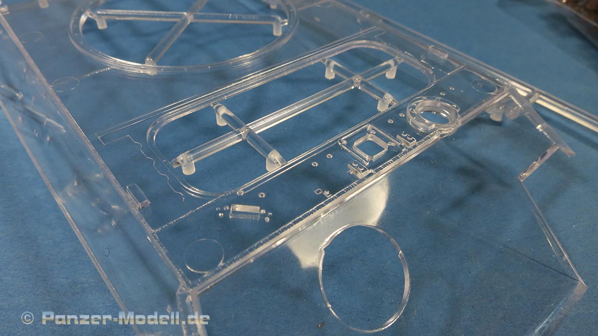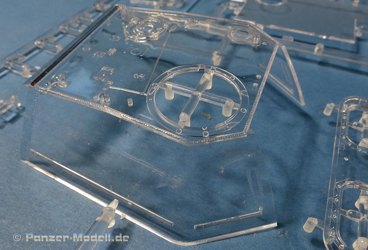 Im Aussenbereich bietet der Bausatz ebenfalls alles, was das Modellbauerherz begehrt. Was diesen Bausatz (in der ersten Edition) besonders zum Hinkucker macht, sind die Klaren Bauteile für Turm und Oberwanne - dabei handelt es sich um perfektes, glasklaren Plastik, das ohne Verzerrungen den Blick in den detaillierten Innenraum erlaubt!