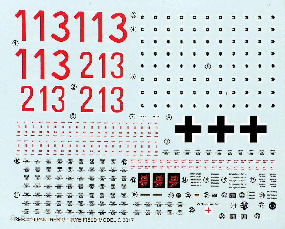 Der sauber gedruckte Decalbogen enthält in der Hauptsache allgemeine Markierungen für den Innenraum und die Munition, sowie natürlich die Markierungen einzelner Fahrzeuge.