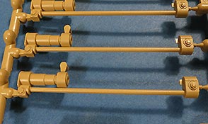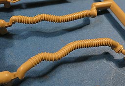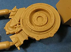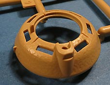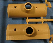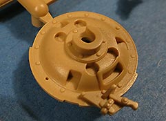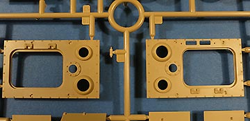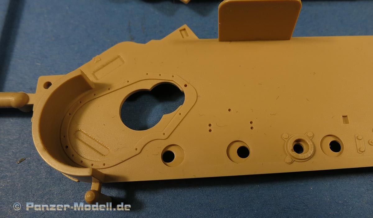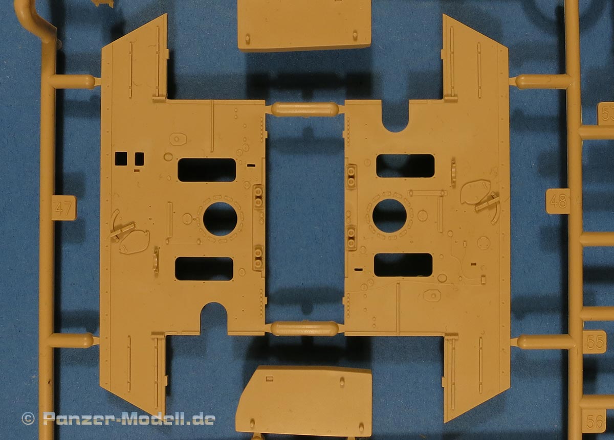 Die Unterwanne setzt sich aus Bodenplatte, den Seitenwänden, sowie Heckwand und Bugplatten zusammen und weisen bereits angegossene, beeindruckende Details auf. Die Schwingarmhülsen werden einzeln und nach rechts und links getrennt in die Wanne eingeklebt. Auch diese zeigen sehr schöne Details, wie man sie bisher kaum bei Modellen in 1:35 gesehen hat. Die Schwingarme selber werden einzeln eingesteckt und können entwerder arretiert oder, durch entfernen einer Passnase, beweglich eingebaut werden.