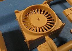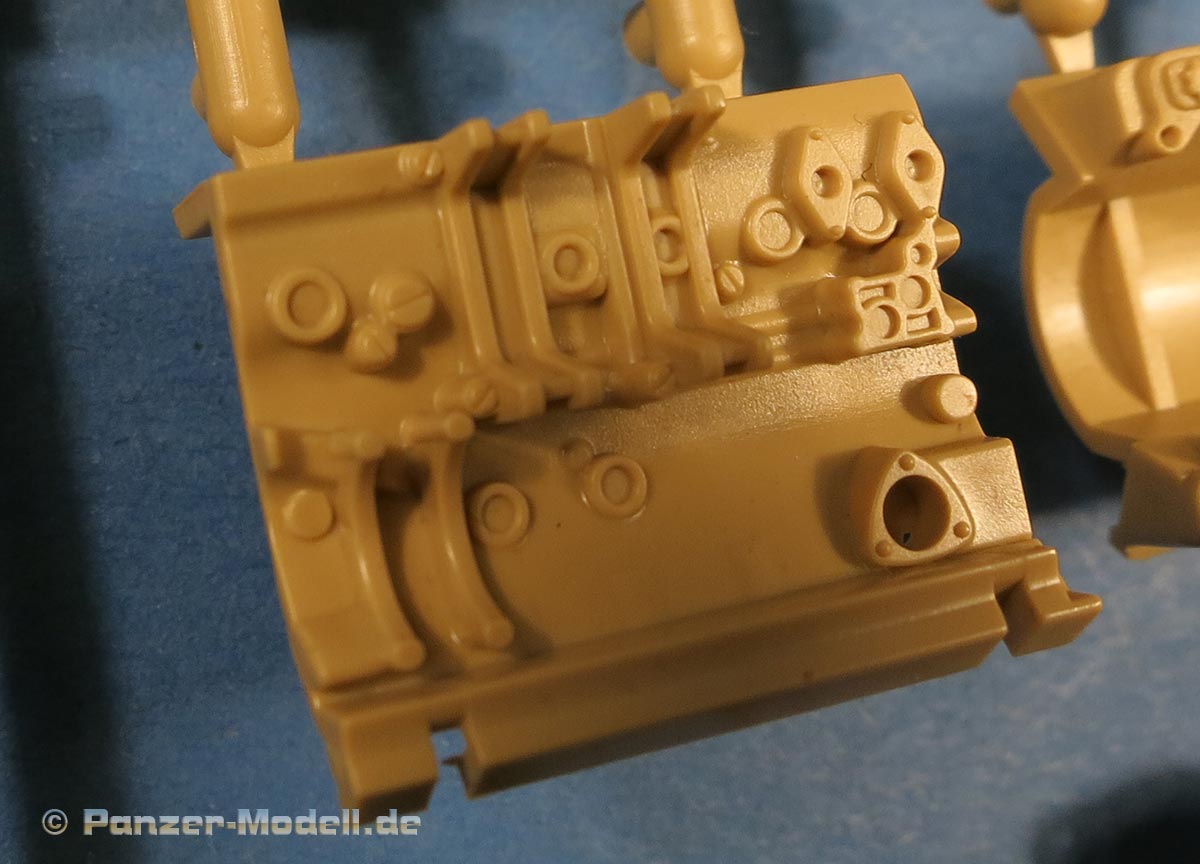 Der Motorraum ist ebenfalls komplett enthalten und sehr fein detailliert mit allen Motorraumwänden und entsprechenden Details, dem Motor an sich, Anbauteile, Leitungen, Abgasrohre, Luftfilter, Kühler, Lüftereinheit mit Lüfterradschaufeln, Tanks und Zuleitungen als Optionsteile für die Kampfraumheizung.