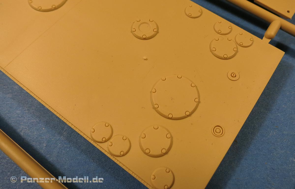 Die Detailierung macht einen ganz hervorragenden Eindruck mit feinen, sauberen und scharfen Details an allen Teilen und das betrifft auch die Teile aus klarem Plastik - Nieten/Schraubenköpfe, Schweißnähte, usw. alles sehr fein dargestellt.