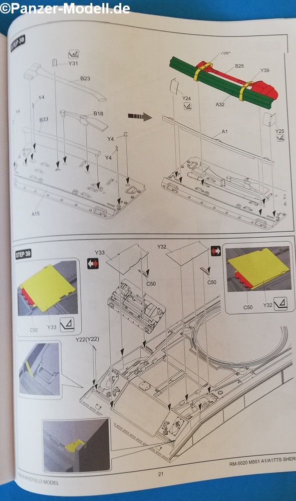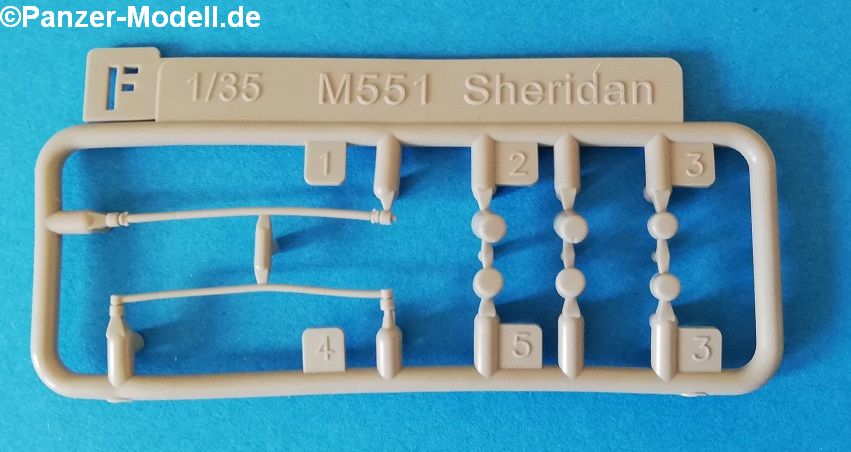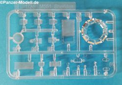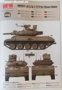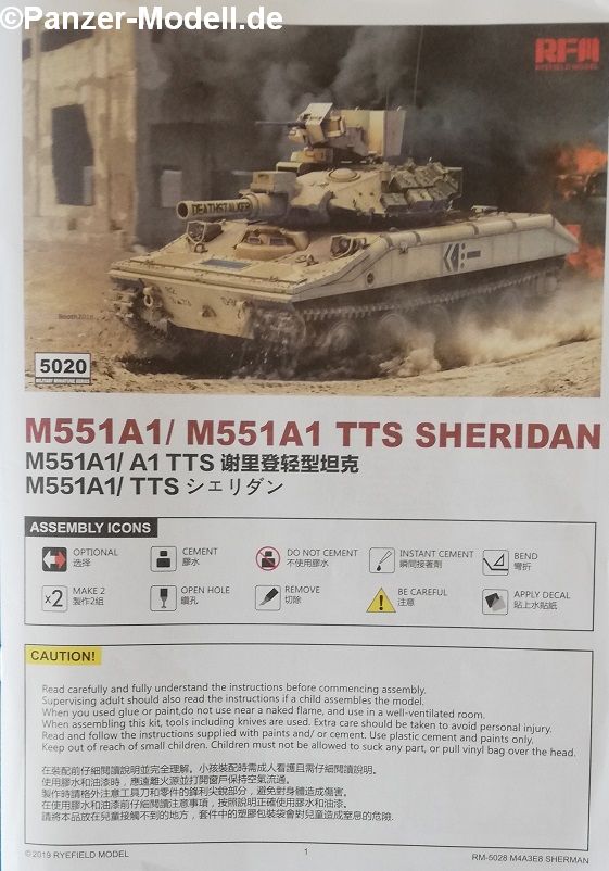Der M551 Sheridan (benannt nach dem Unionsgeneral Philip Henry Sheridan aus dem Sezessionskrieg) ist ein leichter Aufklärungspanzer, der ab 1960 von General Motors unter der Bezeichnung XM551 entwickelt wurde. Das erste Serienfahrzeug wurde im Juni 1966 fertiggestellt. Die Produktion dauerte bis 1970. Es wurde als lufttransportfähiger Aufklärungspanzer entworfen. Es war mit der technisch fortgeschrittenen, aber anfälligen M81 152-mm-Kombinationswaffe ausgerüstet, die sowohl konventionelle Munition als auch die MGM-51 Shillelagh-Panzerabwehrrakete abfeuern konnte Der Sheridan hatte mehrere entscheidende Vorteile: Er blieb nicht so oft im Schlamm stecken wie der 52 Tonnen schwere M48 Patton, und er warf auch nicht so oft die Kette. Dies machte den kleinen Panzer bei seinen Besatzungen sehr beliebt. Das geringe Gewicht und die hohe Mobilität erwiesen sich als wertvoll, und die Waffe erwies sich als effektive Antipersonenwaffe, wenn sie mit der M657 HE-Munition oder der M625-Kanistermunition verwendet wurde. Die Armee begann ab 1978 den Sheridan auszumustern, obwohl es damals keinen wirklichen Ersatz gab. Die 82d Airborne Division konnte sie jedoch bis 1996 behalten. Lange Jahre gab es in 1:35 aus Plastik nur das Tamiya Modell von 1971 (mit allen Wiederauflagen) inklusiver seiner Klone von Academy. 2005 brachte Academy eine neue Bausatzform heraus, diese konnte jedoch nicht vollständig überzeugen es gab dort grundlegende Probleme in der Maßhaltigkeit, als Beispiel sei hier nur einmal die völlig überdimensionierte Hauptwaffe genannt. 2019 brachte Tamiya dann eine völlig neue Bausatzform des M551 Sheridan aus dem Vietnamkrieg heraus, die einfach zu bauen ist und das Fahrzeug hervorragend repräsentiert.Und nun hat auch der relative Newcomer Rye Field Models einen völlig neuen Bausatz entwickelt und auf den Markt gebracht nun wollen wir uns ansehen, wie dieser sich schlägt. Der Bausatz enthält Teile für den Bau eines späten Modells M551A1 oder eines M551A1 / TTS Sheridan des 3 / 73rd Armored Regiments. Acht hellbraune Spritzlinge ein durchsichtiger Spritzling für Periskope, Sichtblöcke und die Beleuchtungsanlage; ein Vinylspritzling mit Polykappen und Scheinwerferkabeln; ein Fotoätzbogen, eine Feder und eine separate Oberwanne. An den Spritzlingen ist etwas Fischhaut vorhanden noch finden sich viele Auswerfermarken an später noch einsehbaren Stellen. Mit Ausnahme der Ketten - leider finden sich leider auf allen Einzelgliedern je zwei Auswerfermarken und auf den langen Segmenten auch jeweils mehrere pro Segment. Teilweise wirken die Details etwas schwammig und weich, teilweise sind sie schön scharf gezeichnet. Man hat das Gefühl, das hier zwei verschiedene Formenbauer am Werk waren. Richtig schön sind die Details der Oberwanne und des Turmes. Die Kanone ist zweiteilig, aber hier gibt es im Aftermarket Sektor schon schöne Alternativprodukte. Auch kann die Kanone mit Hilfe einer Feder beweglich gestaltet werden…wer das denn braucht ý˝ Erfreulicherweise haben alternativen Rohre für das beiliegende Browning M2 Maschinengewehr bereits aufgebohrte Mündungen Top. Alle Optiken bestehen aus klarem Plastik und die beiliegenden Fotoätzteile sind sehr sinnvoll und werten das Modell sehr schön auf. Die Unterwanne besteht nicht aus einem einzelnen Bauteil, sondern wird aus mehreren Bauteilen zusammengesetzt, dies ist bei vielen Herstellern momentan Standard und sollte keine Probleme bereiten. Ein rudimentärer Fahrerplatz mit Fahrersitz ist vorhanden, welche in die eigentliche Unterwanne geklebt wird. Die Bauanleitung führt in fünfundfünfzig Schritten zum Ziel und es gibt viele Alternativteile für die beiden verschiedenen Versionen, welche aus dem Bausatz gebaut werden können.