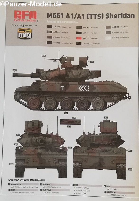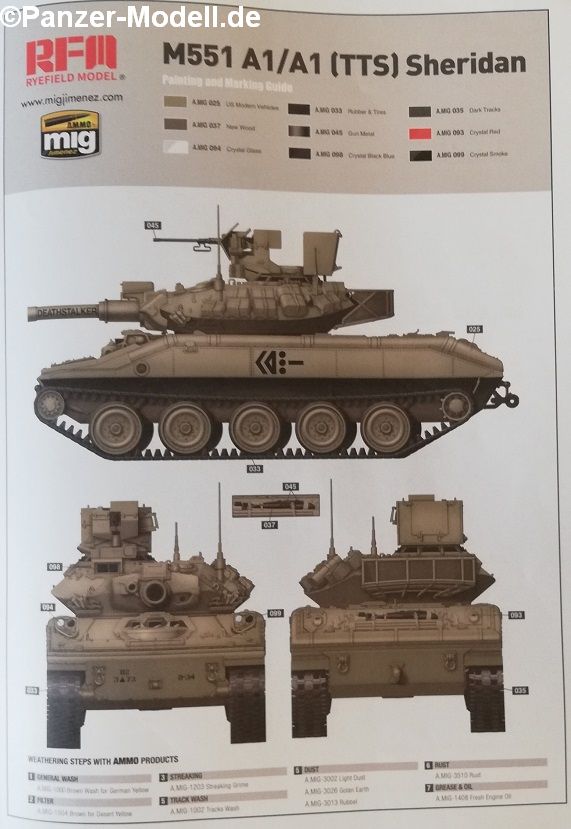 Es sind auch Vorschläge für Alterungsartikel von Ammo by Mig vorhanden, so dass jeder nach seinem Gusto die Fahrzeuge altern lassen kann. Mein Fazit: Kaufempfehlung ein schöner Bausatz. Allerdings ist dieser wohl eher nichts für Anfänger. Der fortgeschrittene Modellbauer wird aber seine Freude haben und eine tolle Replika eines späten Sheridan erhalten.