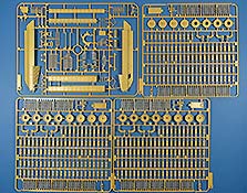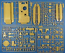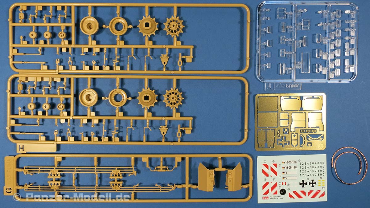 11 sandgelbe Spritzlinge, ein transparenter Spritzling, eine Platine PE Teile, Kupferseil und ein Decalbogen.