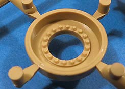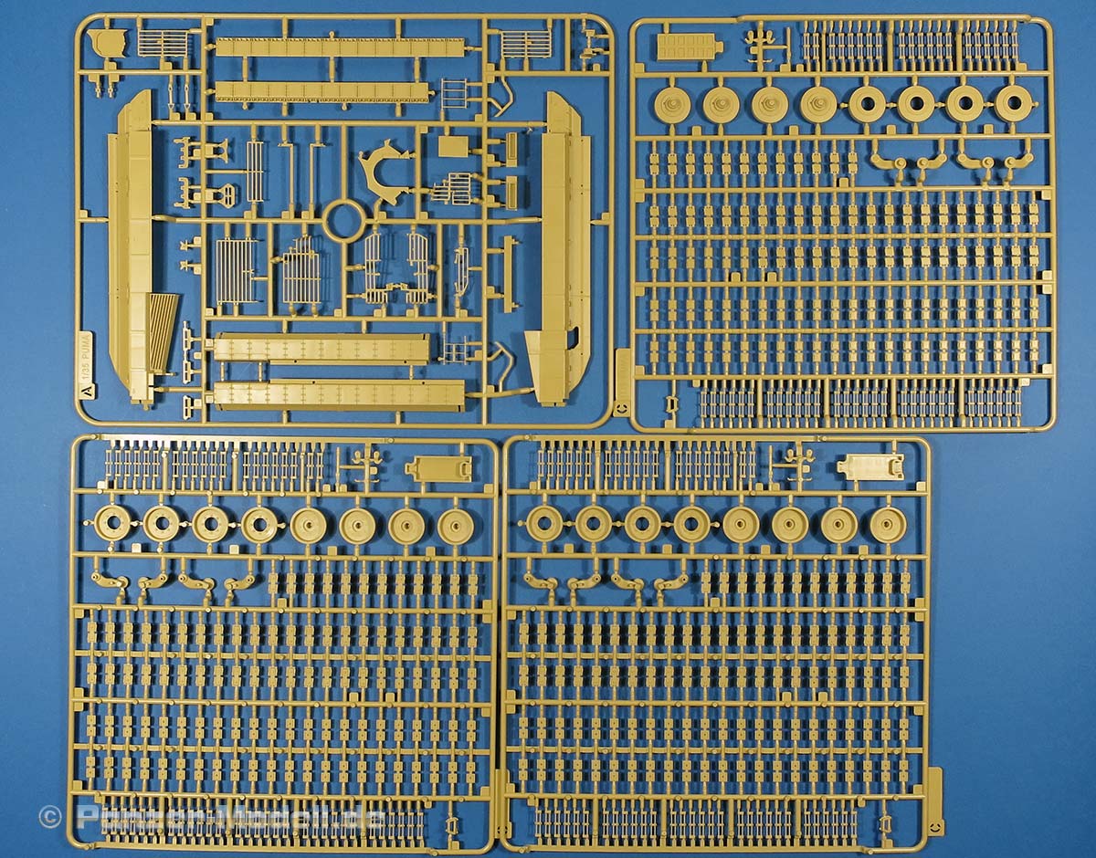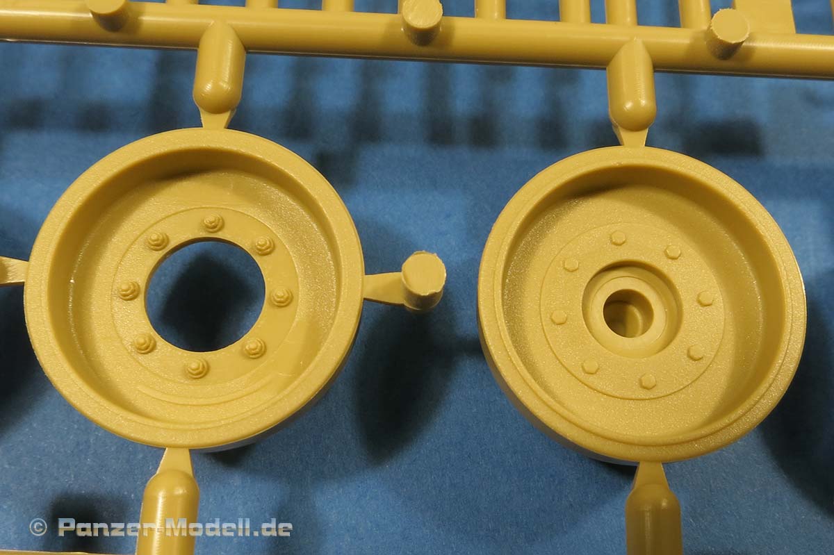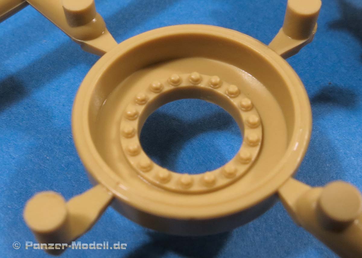 Die Laufrollen, wie auch Leit- und Treibrad sind sehr gut und mit knackscharfen Details gespritzt. Die Angüsse befinden sich, wie leider üblich an den Laufflächen und müssen sauber abgetrennt und versäubert werden - zum Glück isnd es bei den inneren Laufrollen nur zwei, bei den äusseren Laufrollen 4 Angüsse. Alle Rollenkomponenten werden angeklebt und bleiben nicht drehbar - nicht schlimm an sich, für das Aufziehen der Kette wäre zumindest ein drehbares Treibrad schön gewesen.